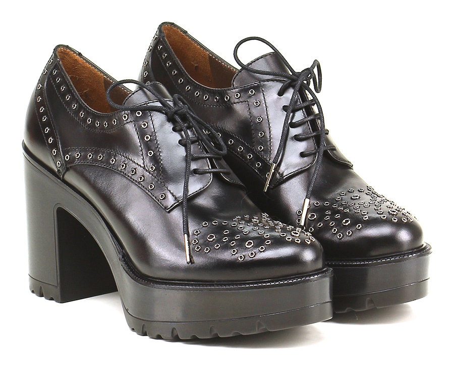 Scarpa con tacco in pelle con borchie su tomaia e suola in gomma. Tacco 100, platform 35 con battuta 65,