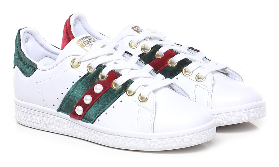 Sneaker in pelle e tessuto con perle su lato esterne e passalaccio dorato. Suola in gomma. Tacco 30, platform 20 con battuta 10.
