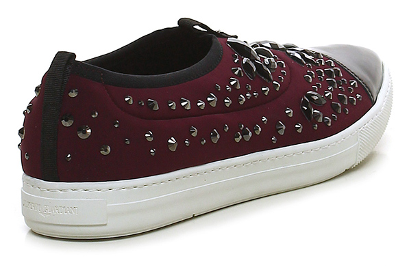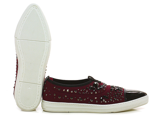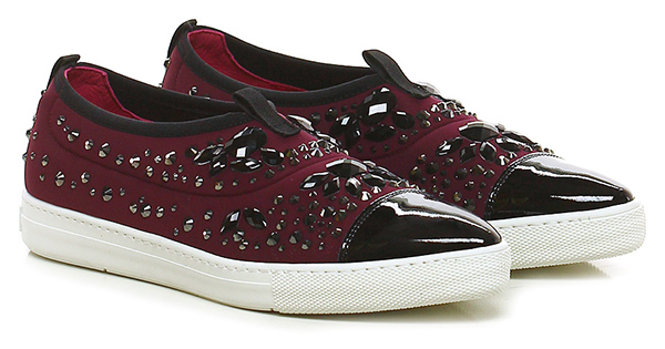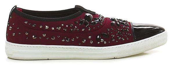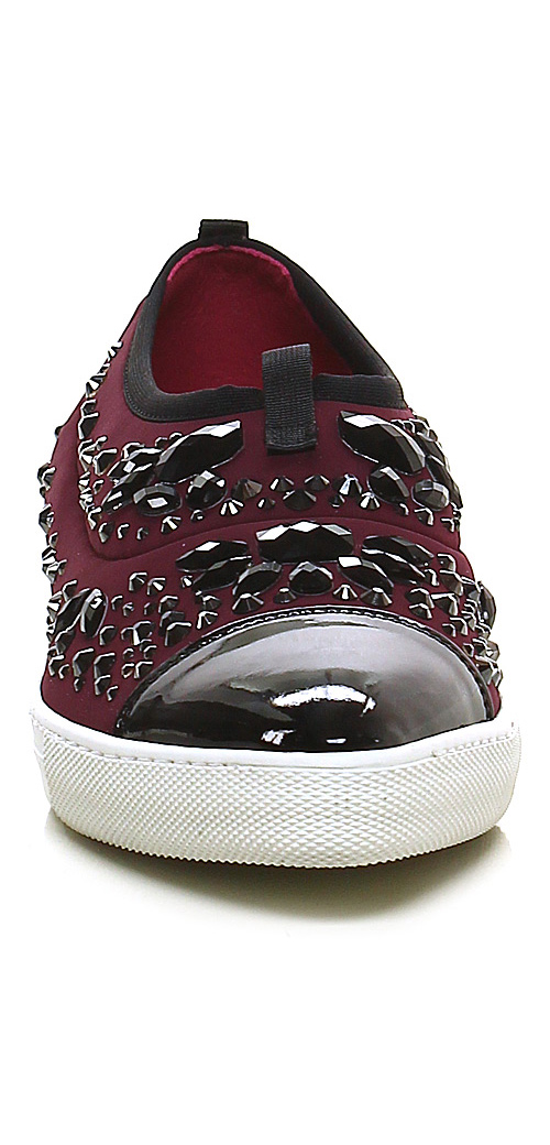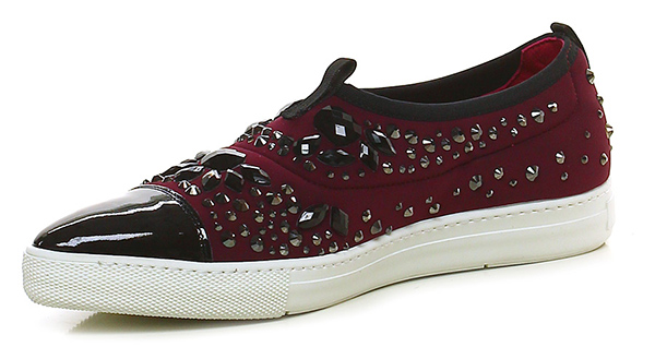 Sneaker in patent leather and stretch fabric with multi-studs and rhinestones on the upper. Rubber sole, heel 30.