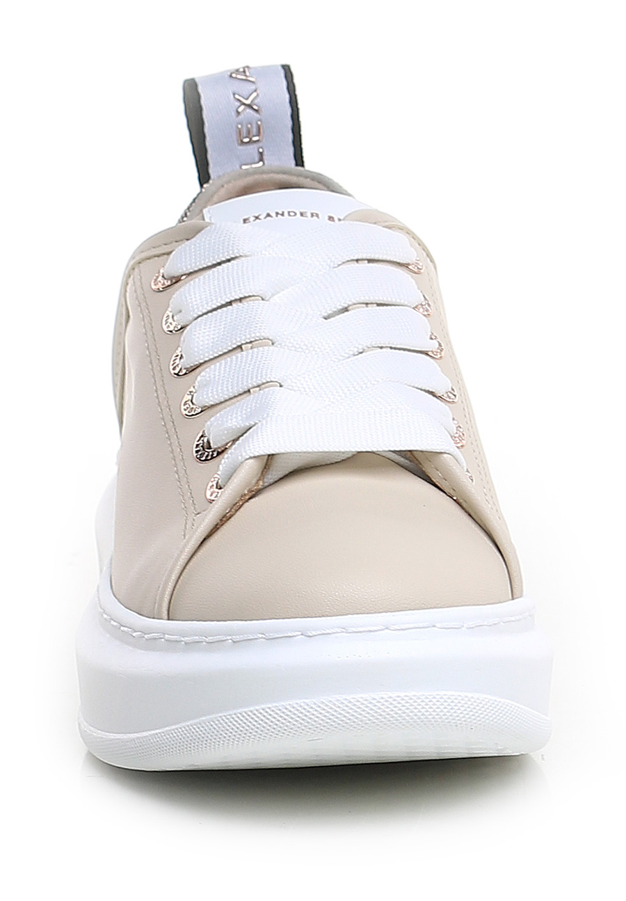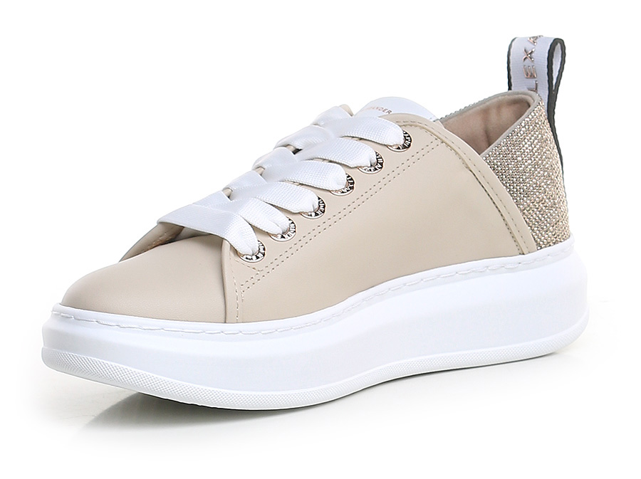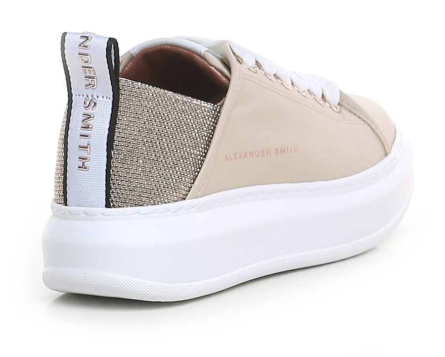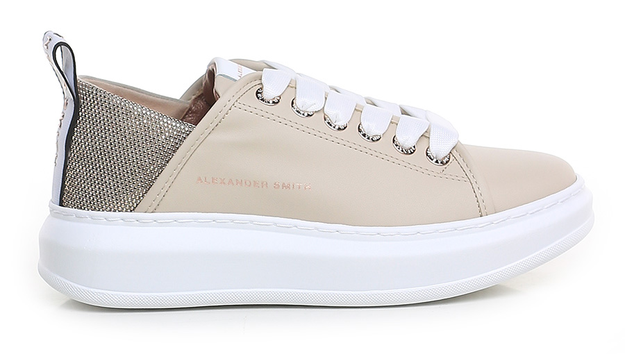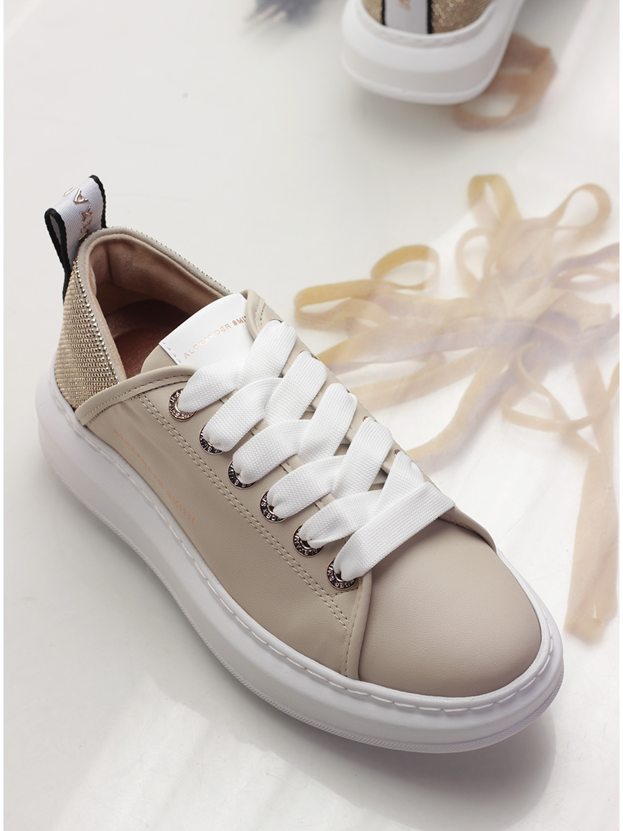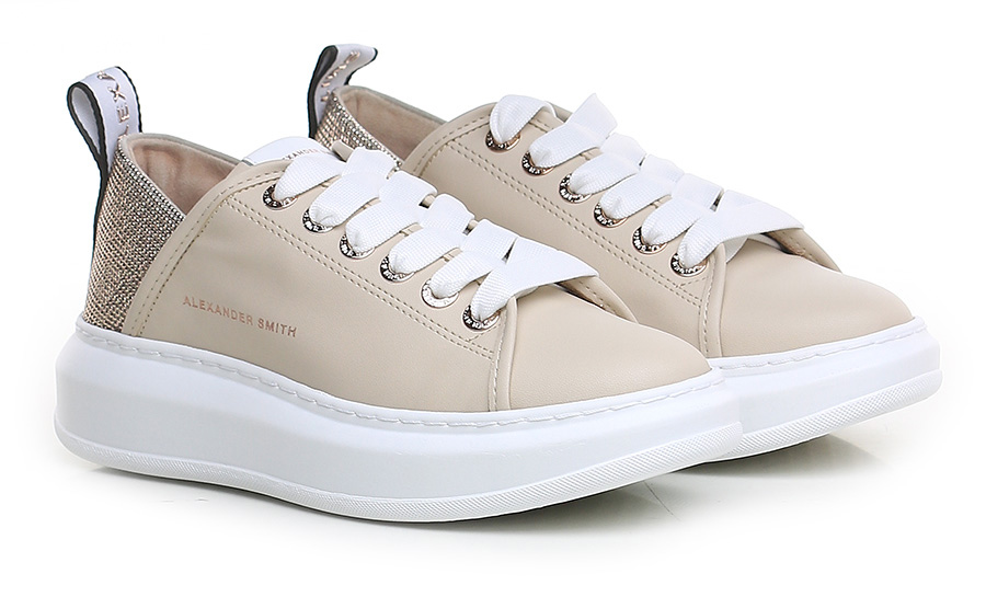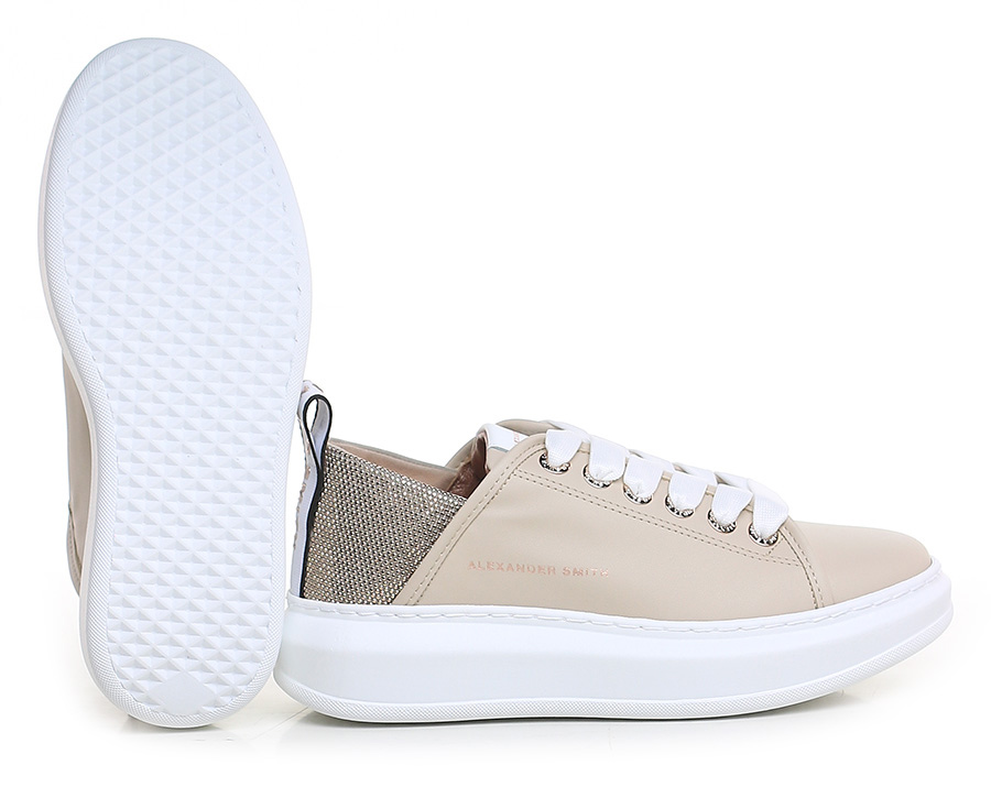 Leather sneaker with rhinestone heel tab and rubber sole. 40mm heel height, 30mm platform with 10mm ledge.