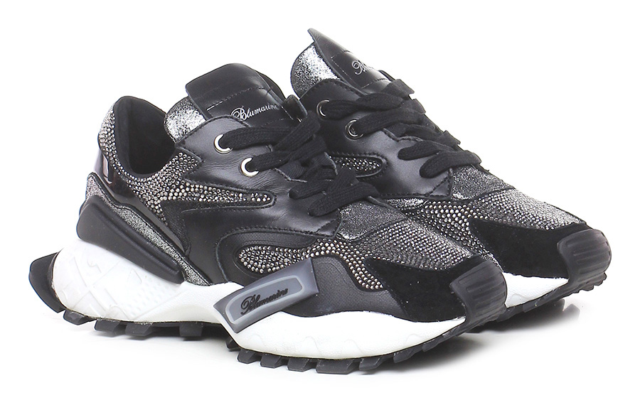 Sneaker in pelle, tessuto, camoscio, inserti gommati e tempestato di strass su tomaia, suola in gomma. Altezza suola: 45, platform 25 con battuta 20.