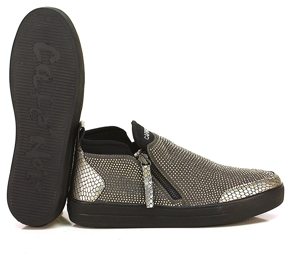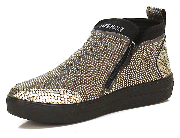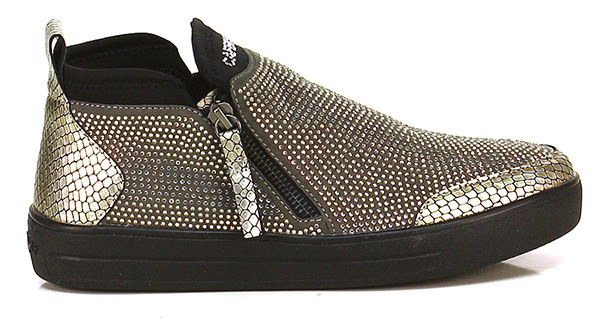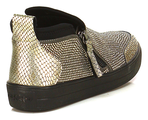 Sneaker in reptile-effect laminated leather and fabric with zip on both sides and rhinestones on the upper. Rubber sole, heel 30.
