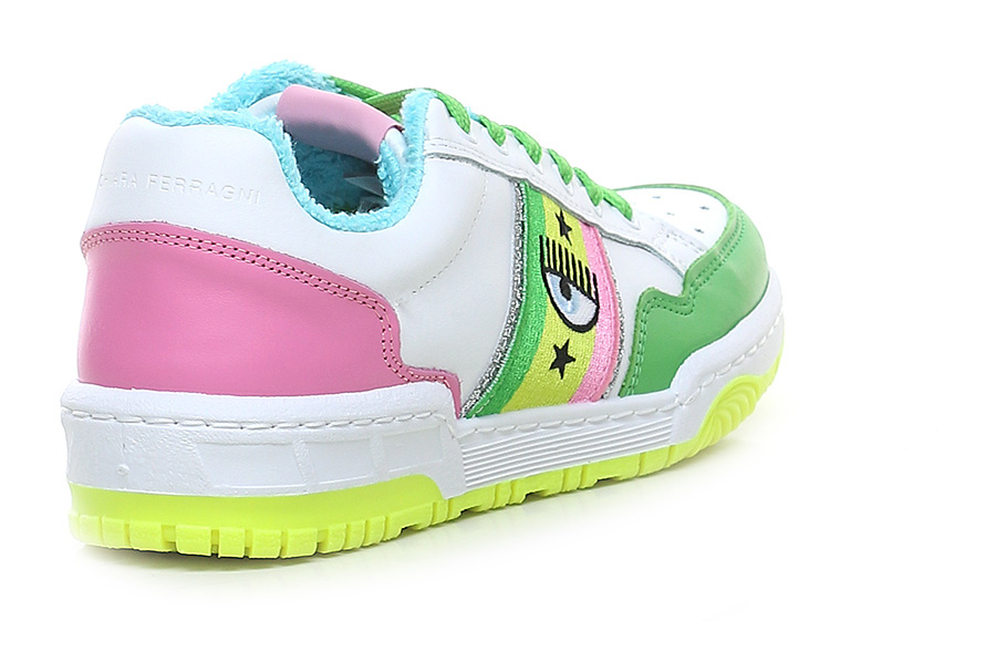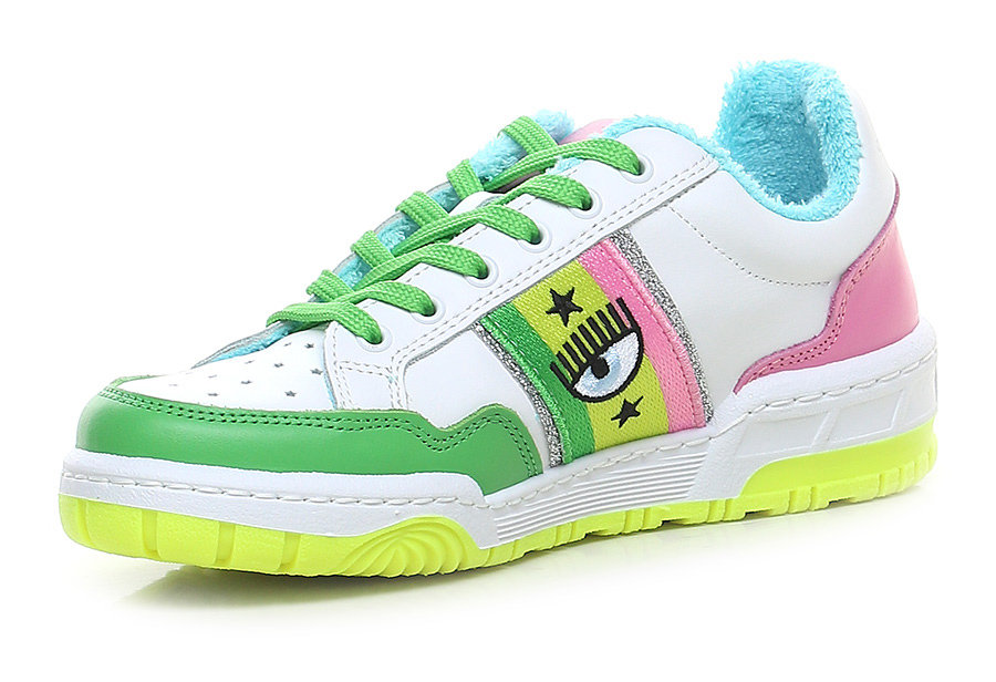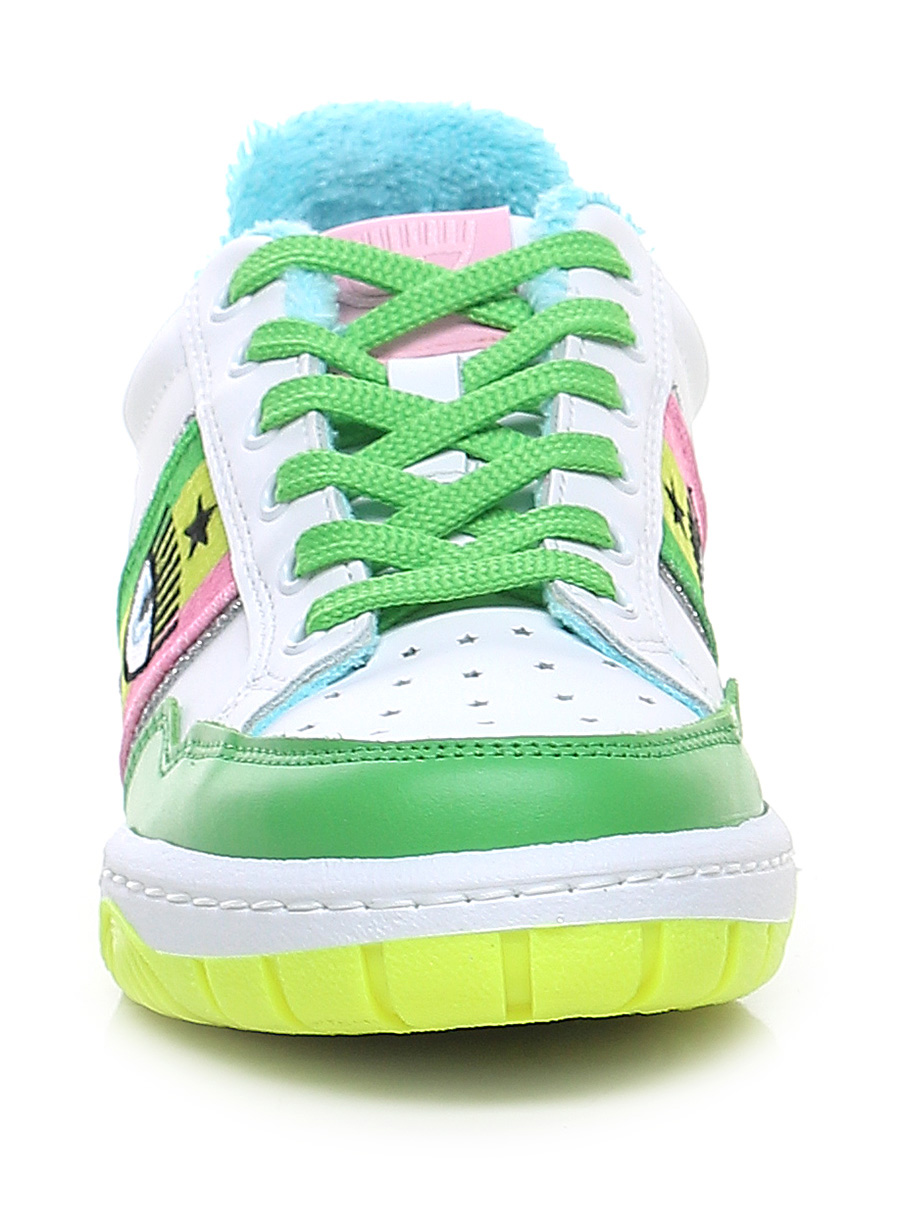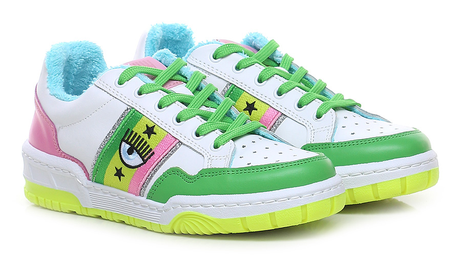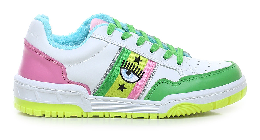 Leather sneaker with side inserts in fabric and glitter. Rubber sole. Heel height 30mm, platform 20mm with 10mm ledge. Sponge interior.