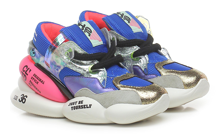 Sneaker in multi pach in pelle, tessuto e inserti pvc. Suola in gomma effetto gonfiato, plantare estraibile. Altezza suola 75, platform 40 con battuta 35. Calzata piccola