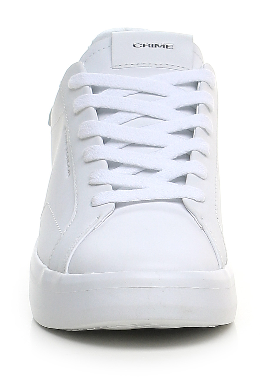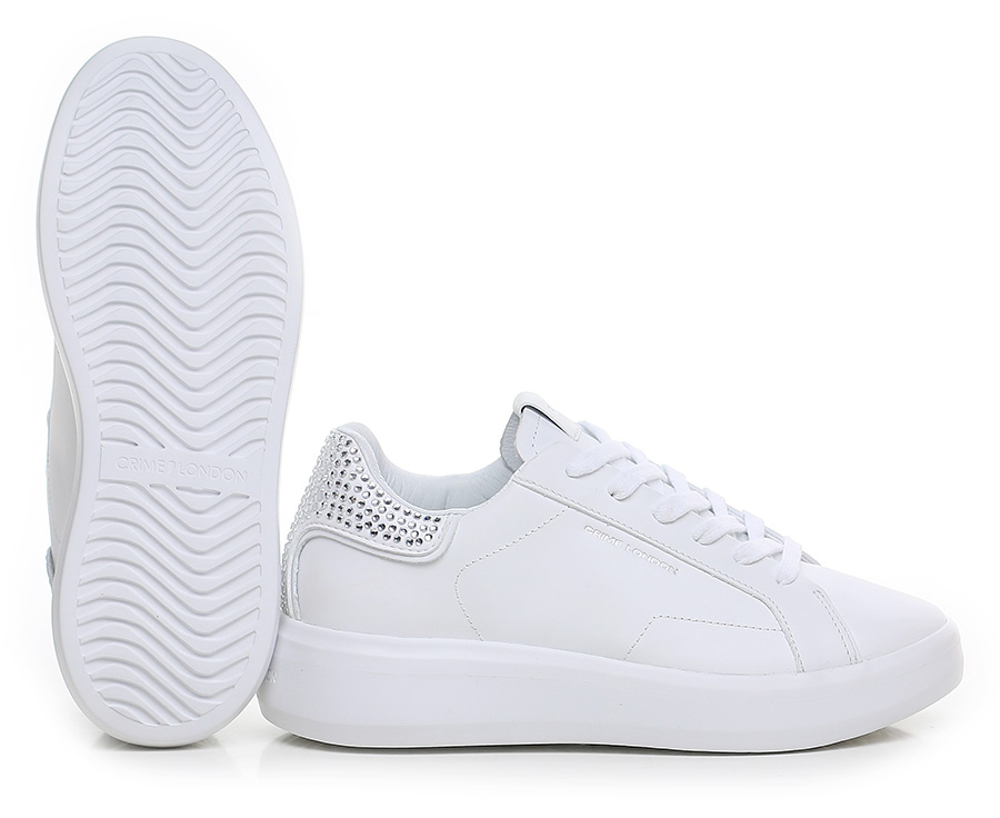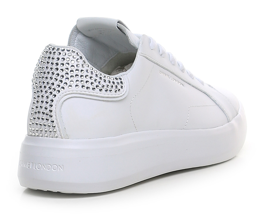 Faux leather sneaker with rhinestones on the back and rubber sole. 40mm heel height, 30mm platform with 10mm ledge.