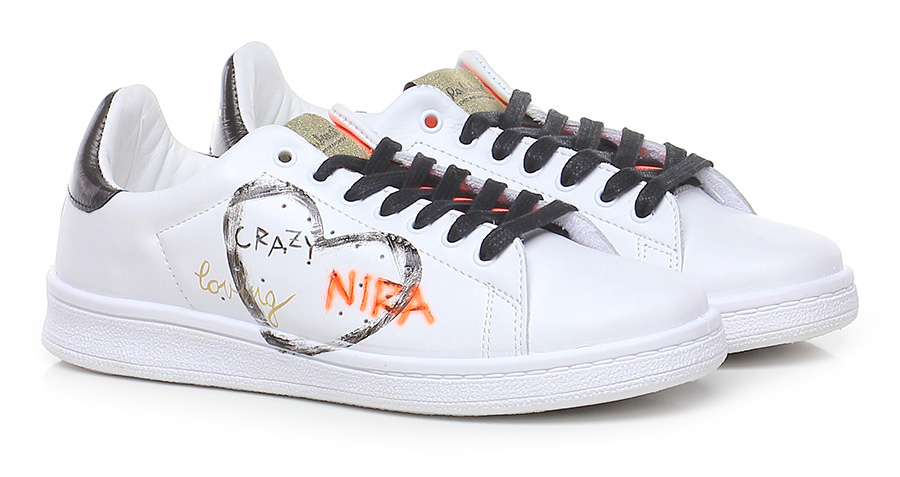 Sneaker in pelle, suola in gomma. Altezza suola: 25, platform 20 con battuta 5. Graffiti lato esterno.