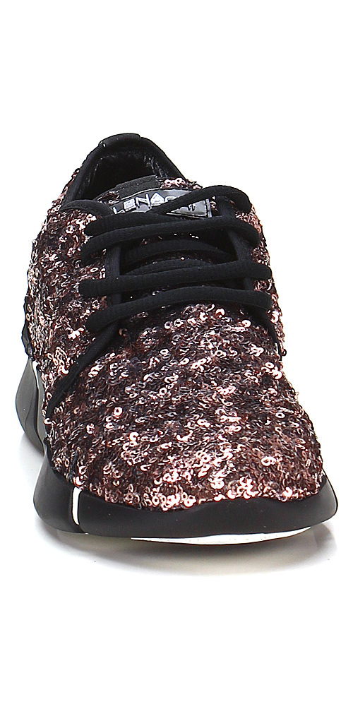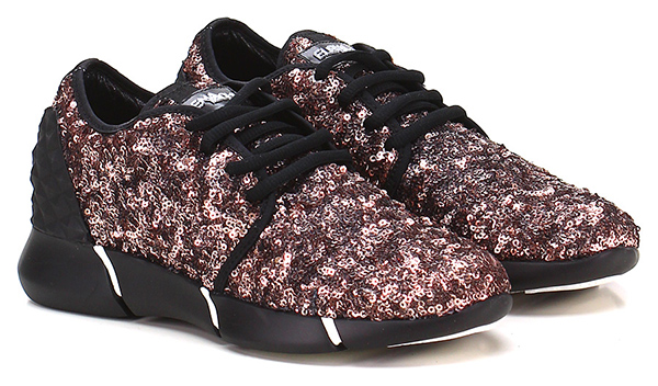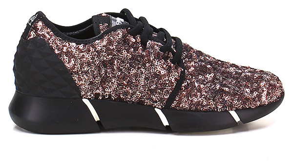 Sequined sneaker with studded effect rubber insert on the heel and extra light rubber sole. 30 heel, 20 platform with 10 bar.