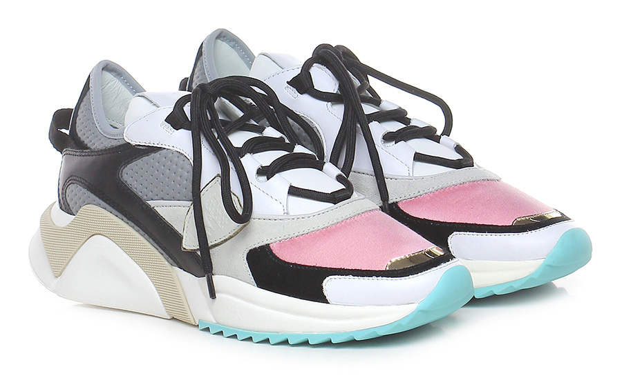 Sneaker in pelle, tessuto in raso e nylon, camoscio,pvc e pelle laminata, suola ove size. Altezza suola: 45, platform 30 con battuta 15.