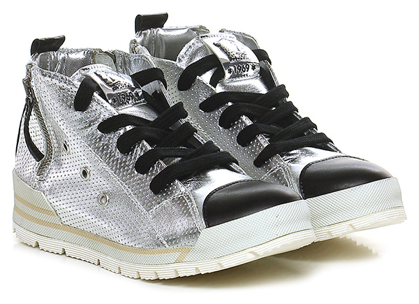 Sneaker in pelle, pelle laminata e pelle laminata forata con zip su ambo i lati. Suola in gomma, tacco 40, platform 25 con battuta 15.