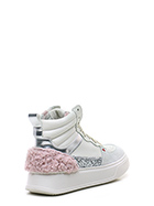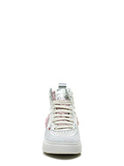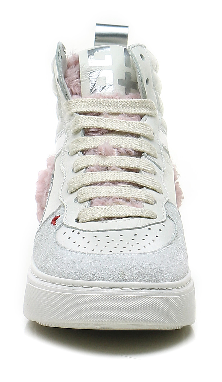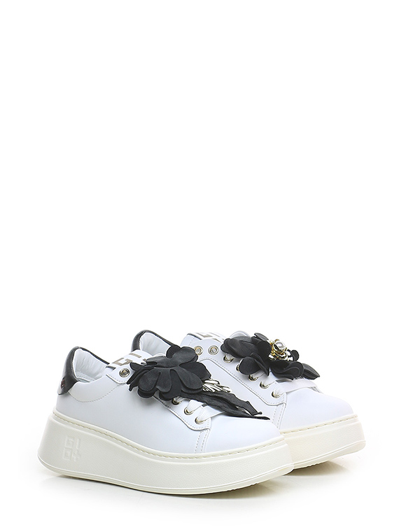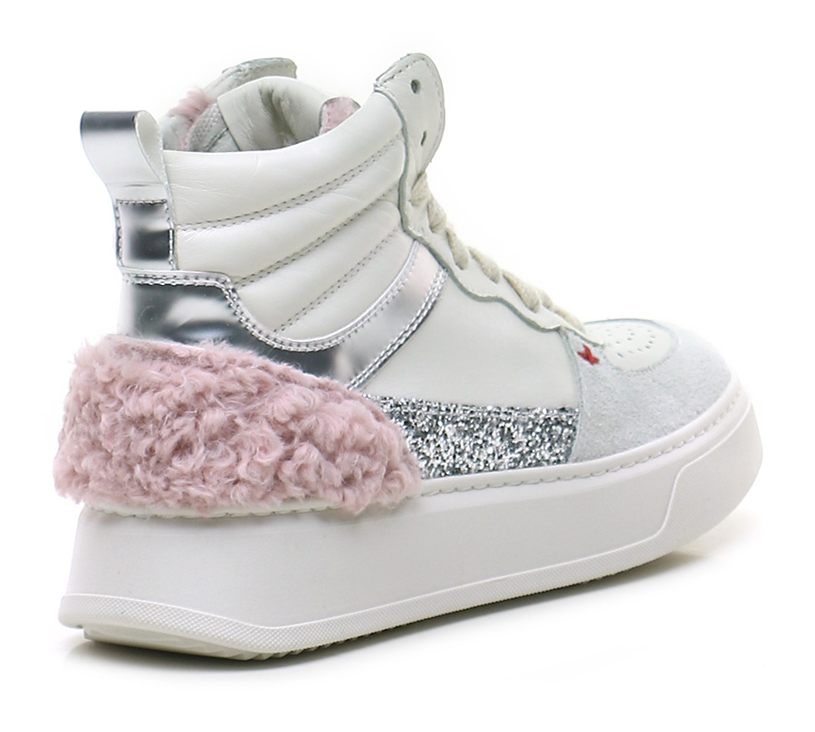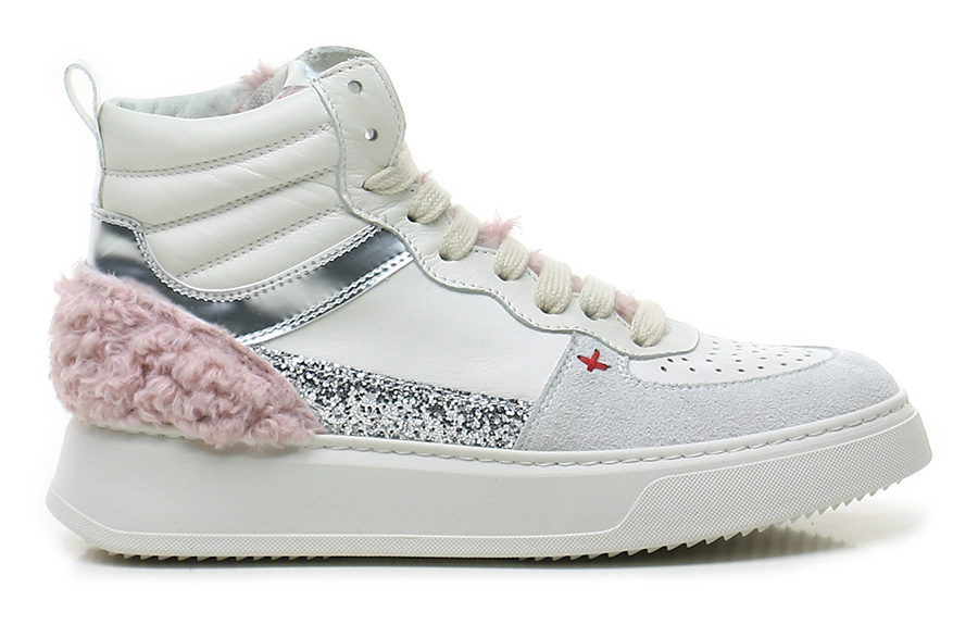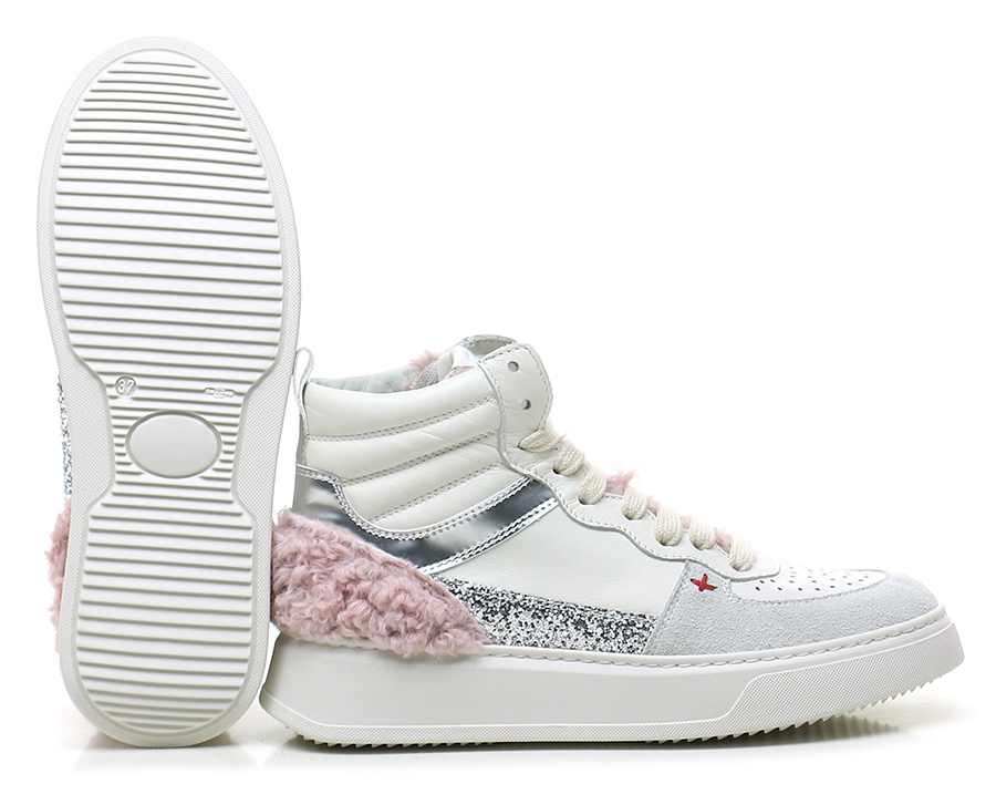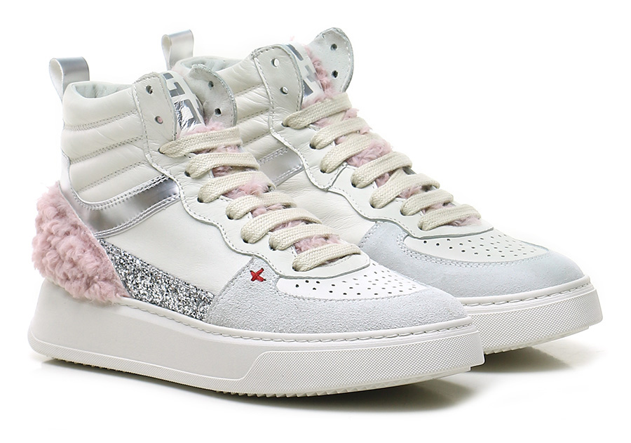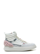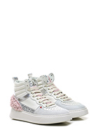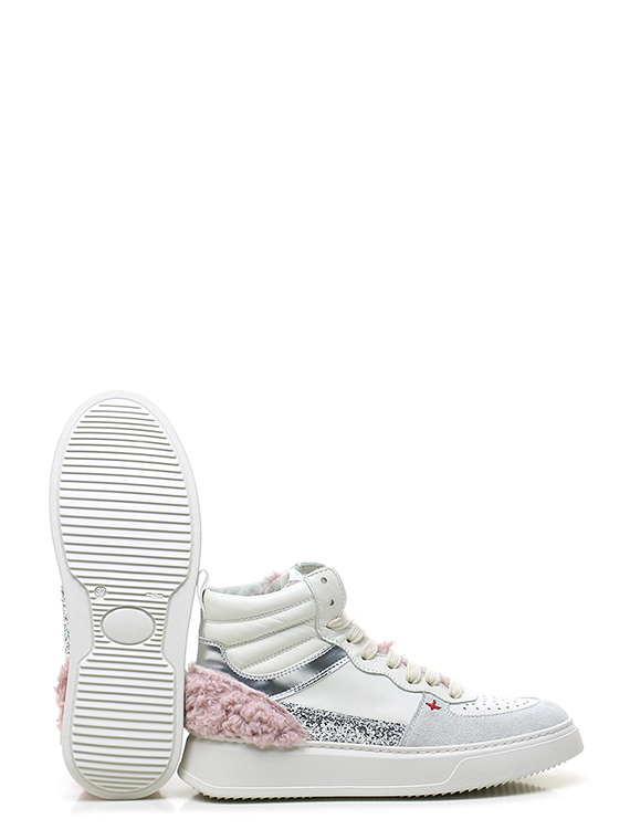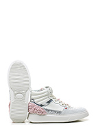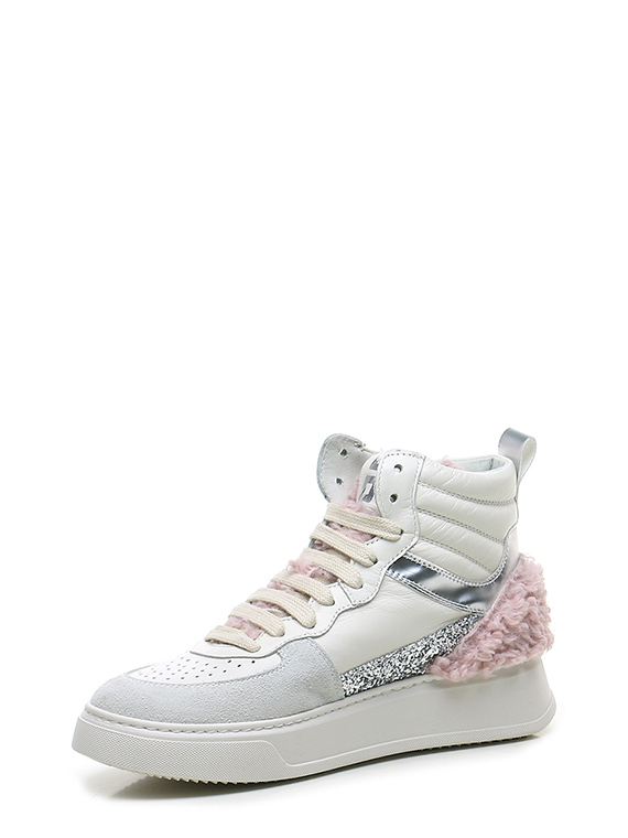 Sneakers in leather and suede, with inserts in fabric, laminated leather and glitter. Rubber sole. 40mm heel height, 30mm platform with 10mm ledge.