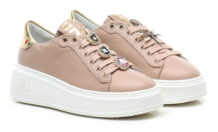 Leather sneaker with laminated leather heel. Rubber sole. 50mm heel height, 35mm platform with 15mm ledge. Acessories with removable on laces.