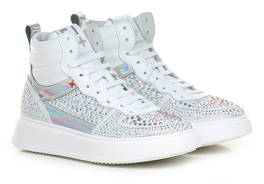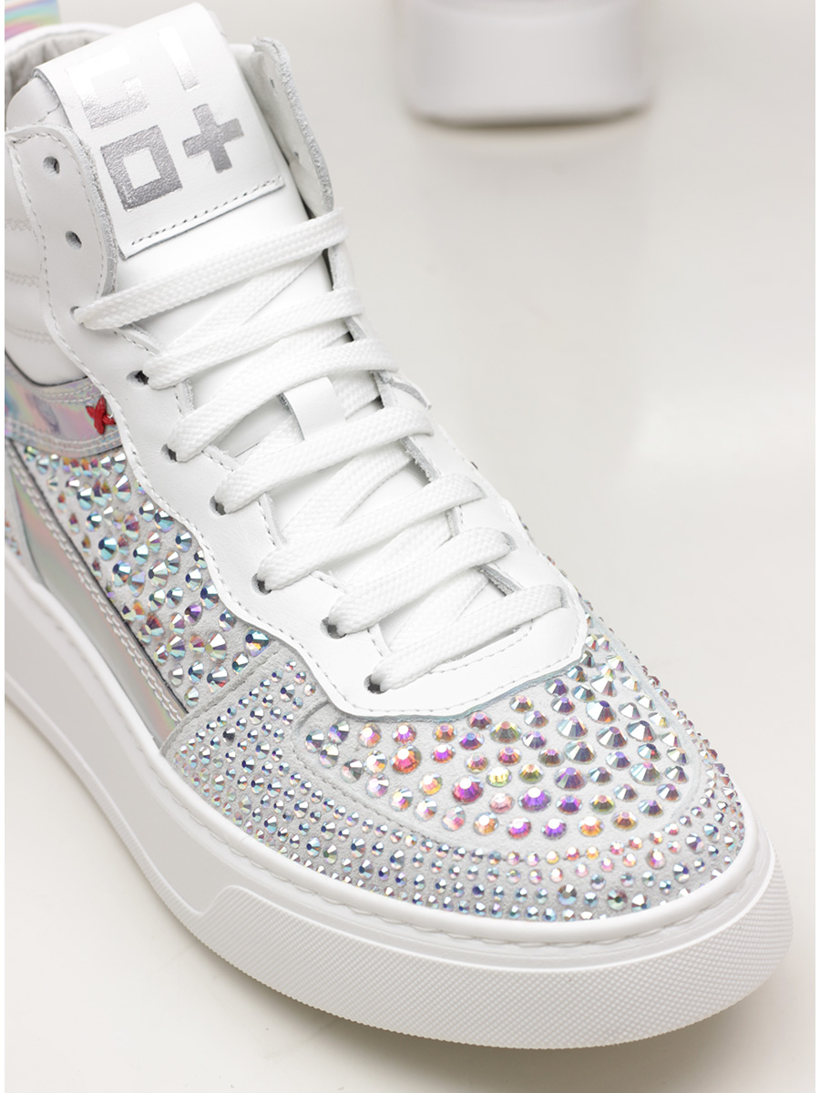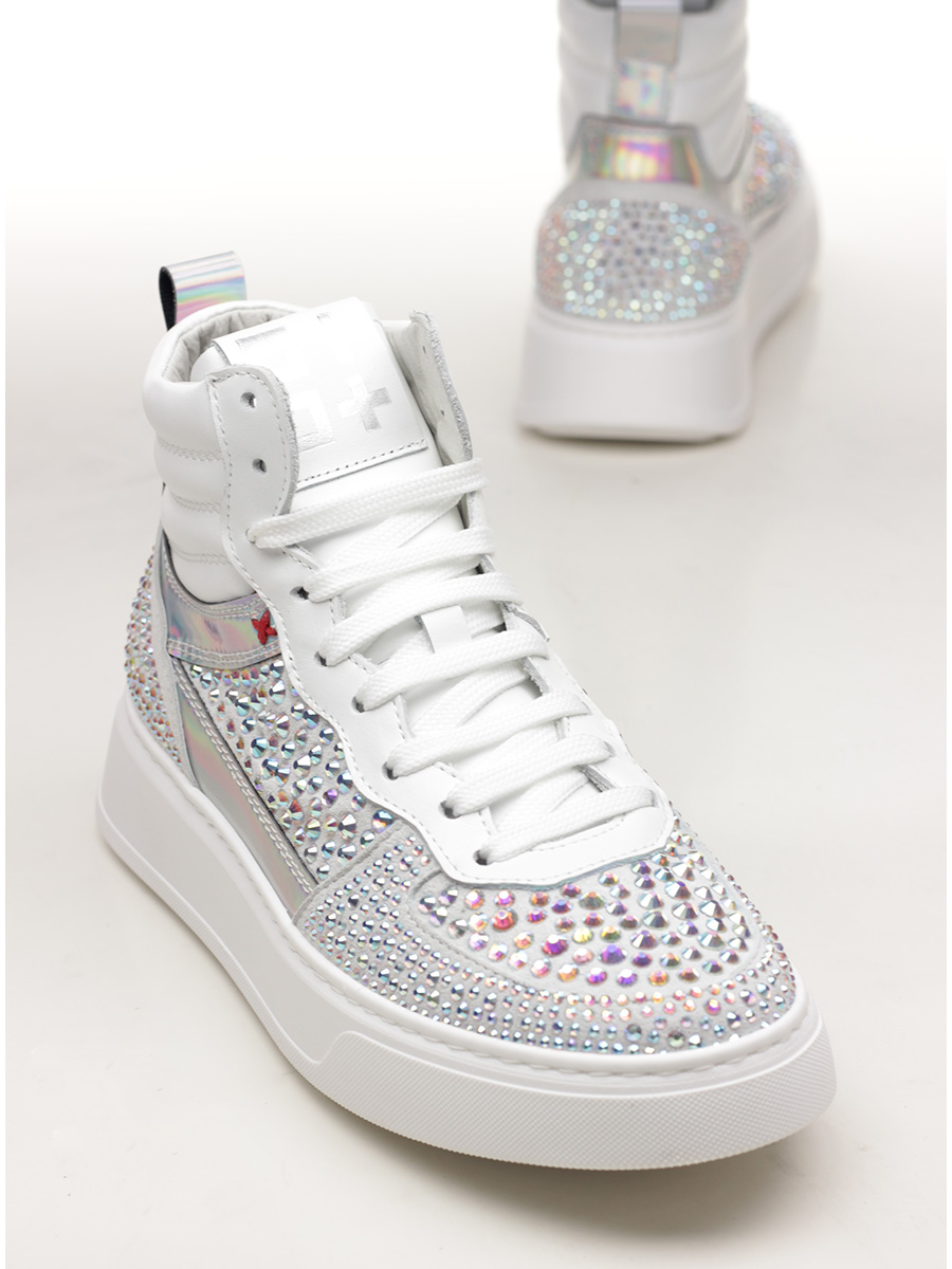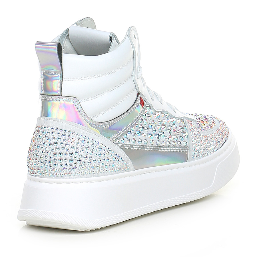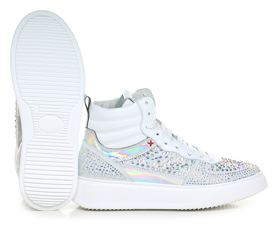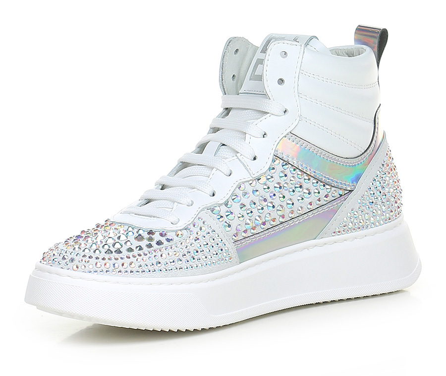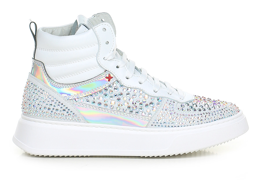 Sneaker in suede, leather and mirrored leather with rhinestones on the upper. Rubber sole. 40mm heel height, 30mm platform with 10mm ledge.