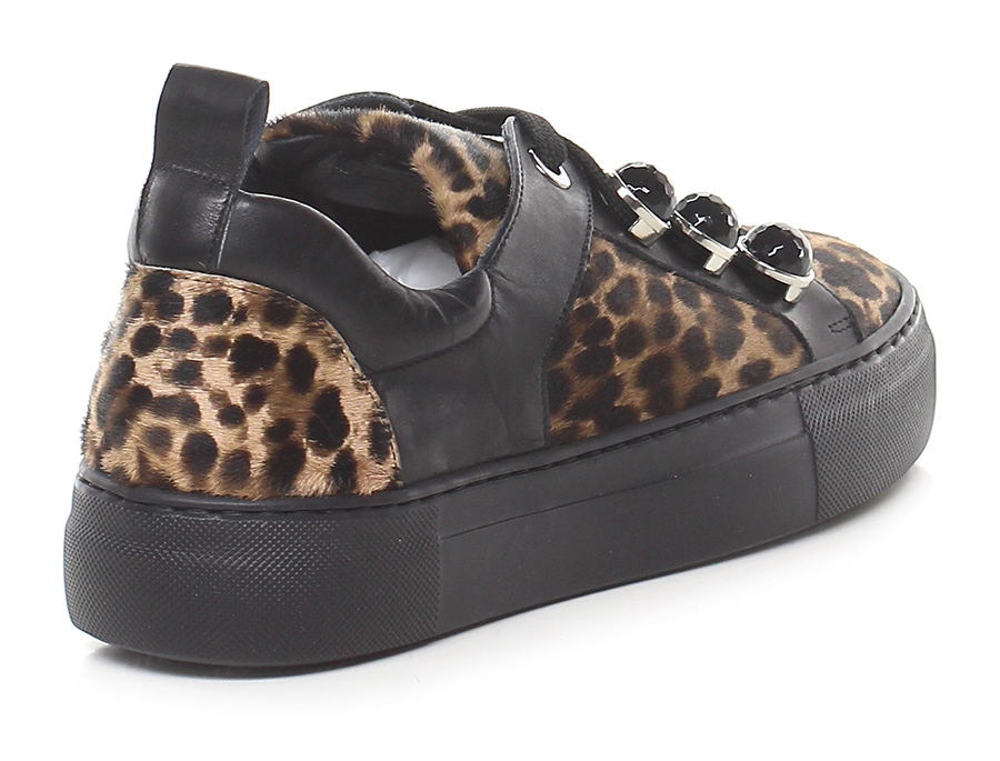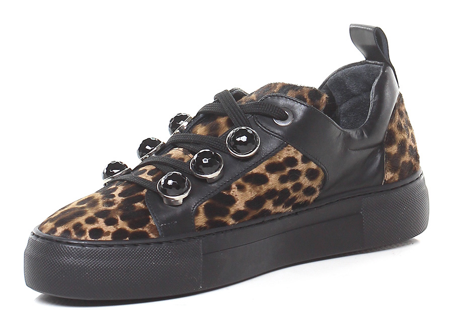 Leather and pony sneaker with pearl application. Light rubber sole, 35 heel.