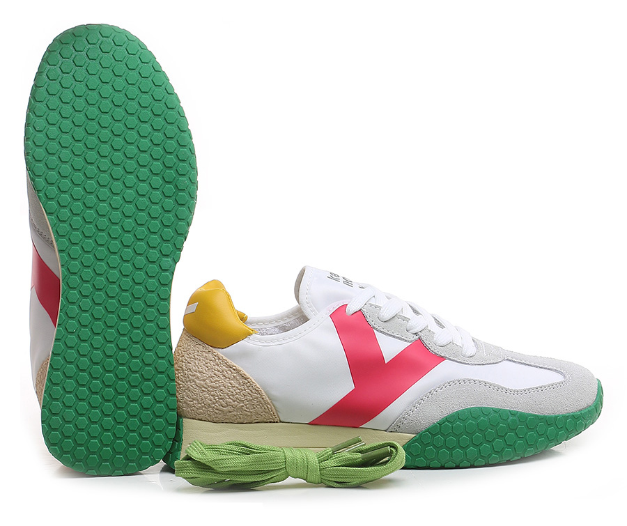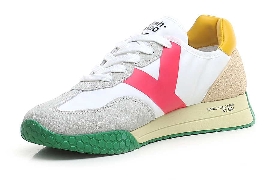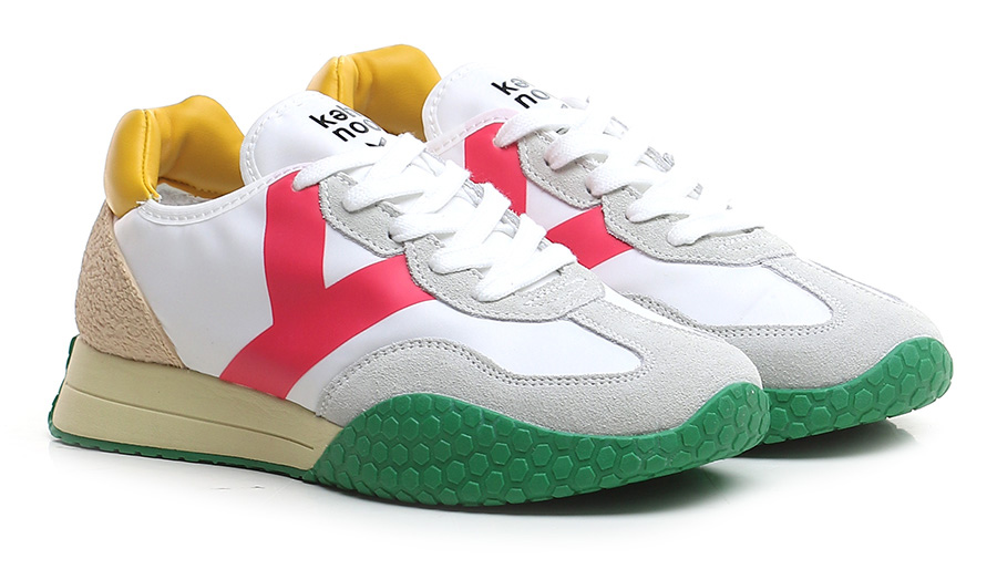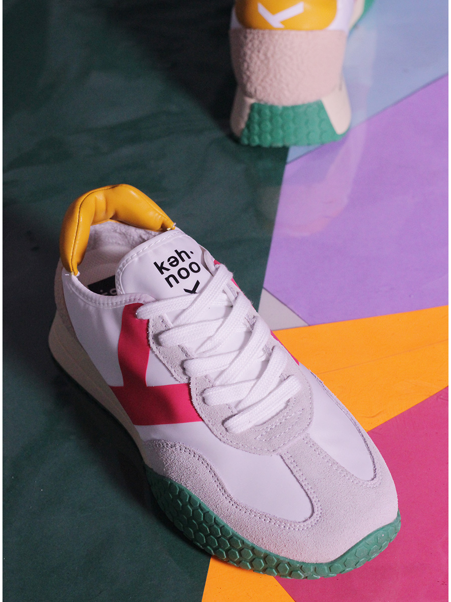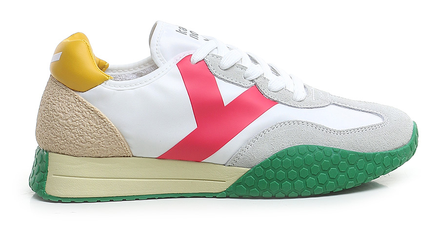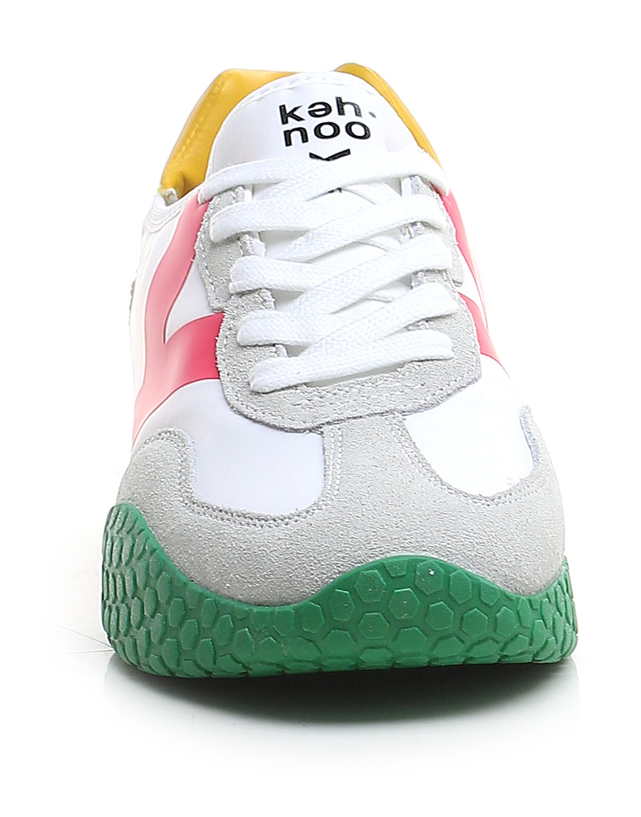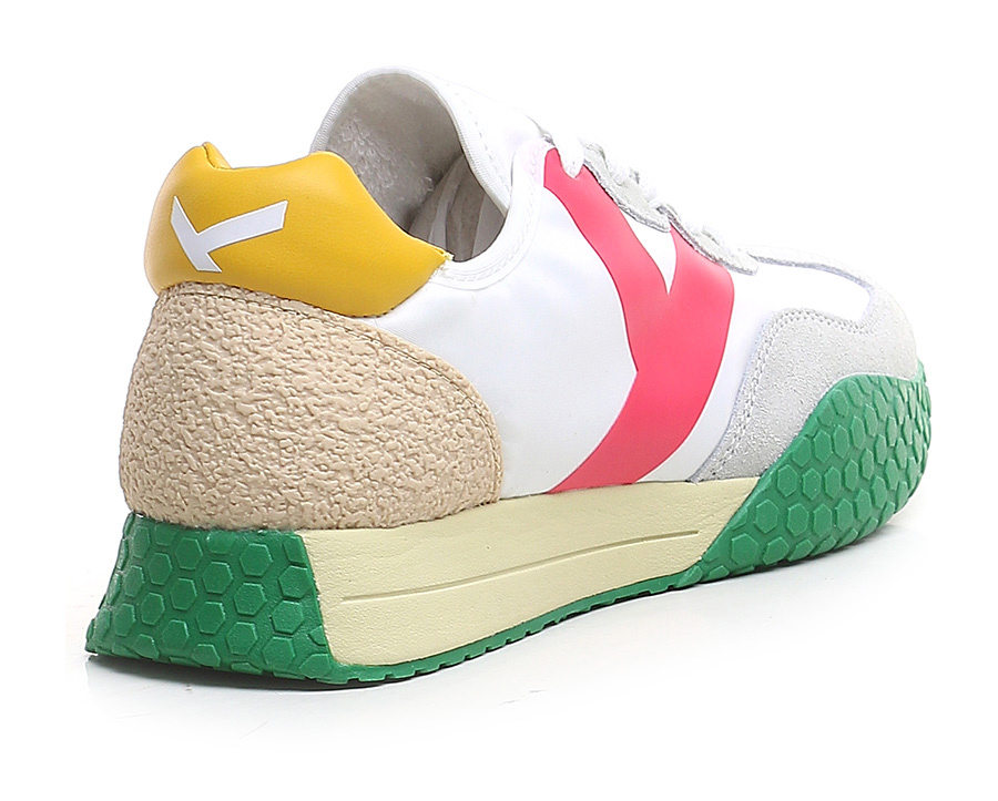 Sneaker in fabric and suede with leather heel tab and pvc insert on the back. Rubber sole. Heel height 30mm, platform 20mm with 10mm ledge.