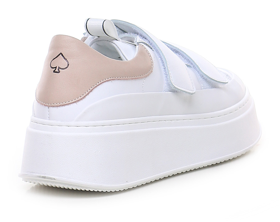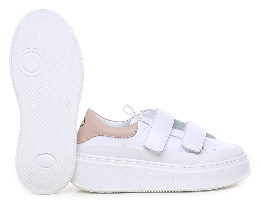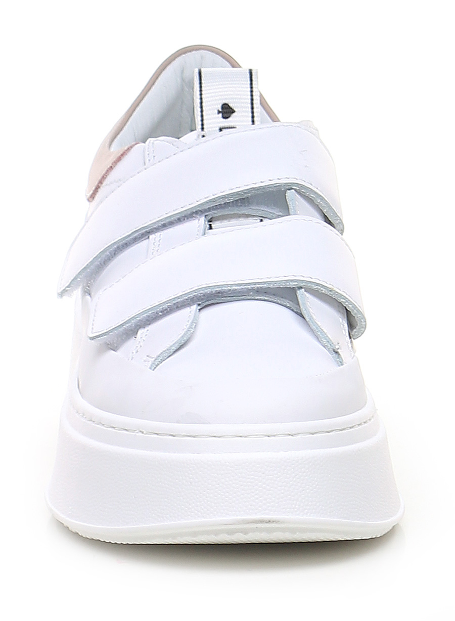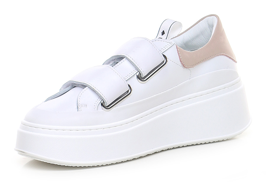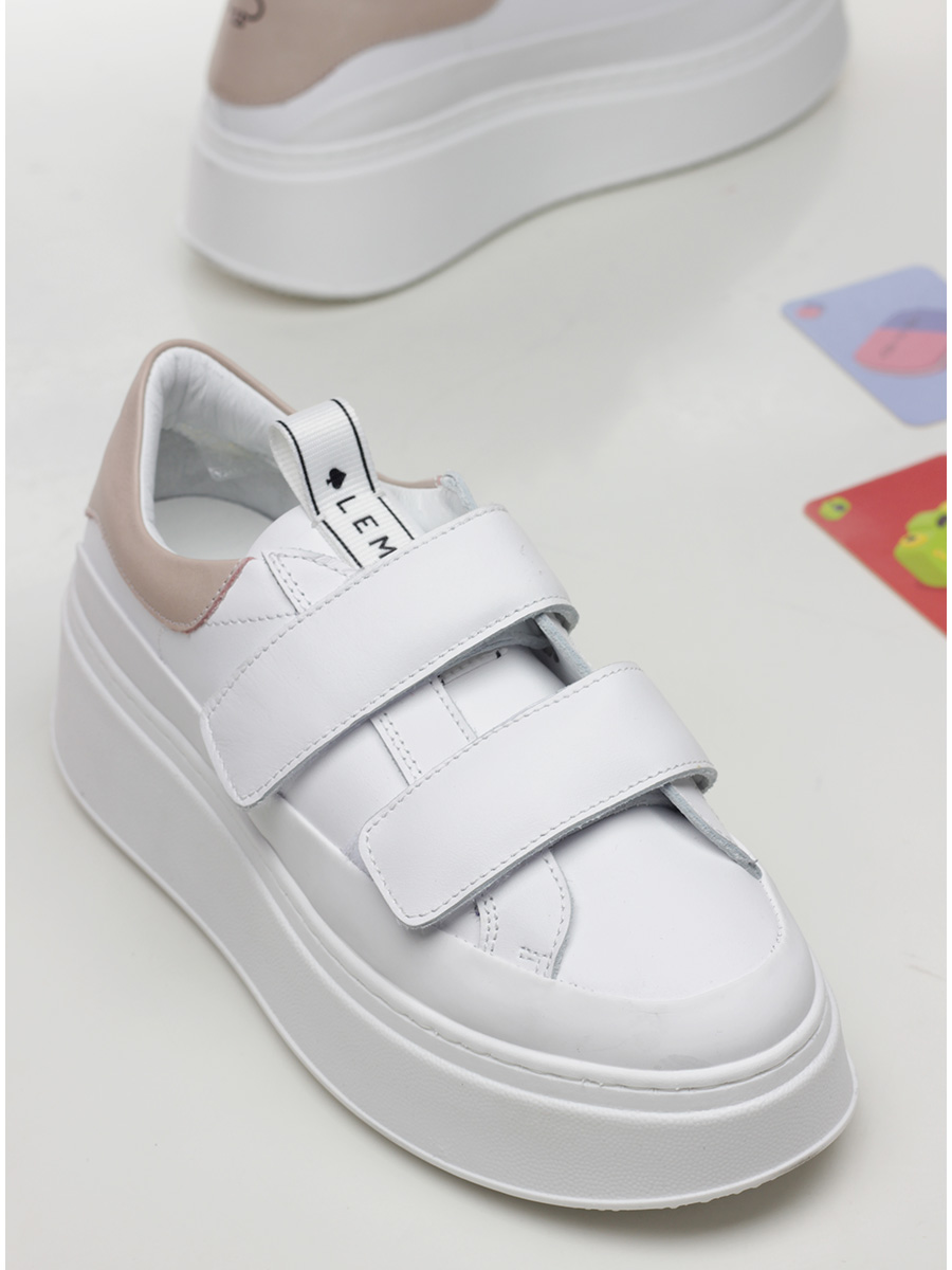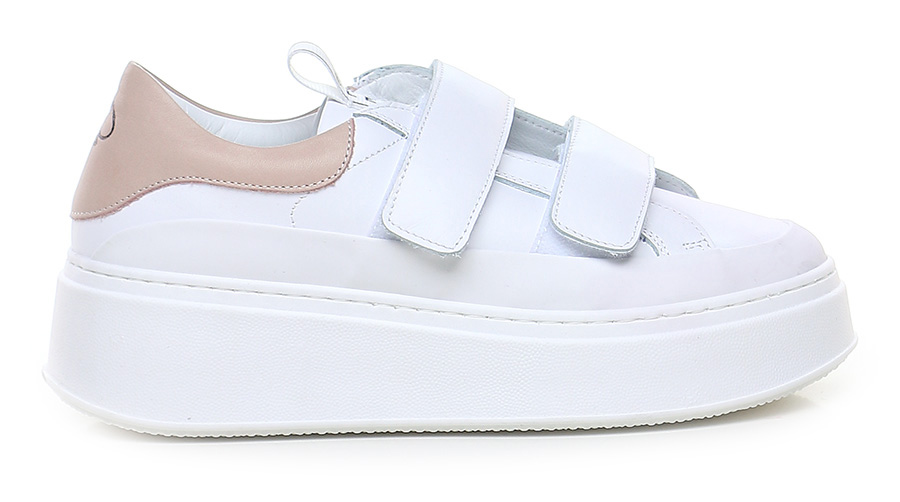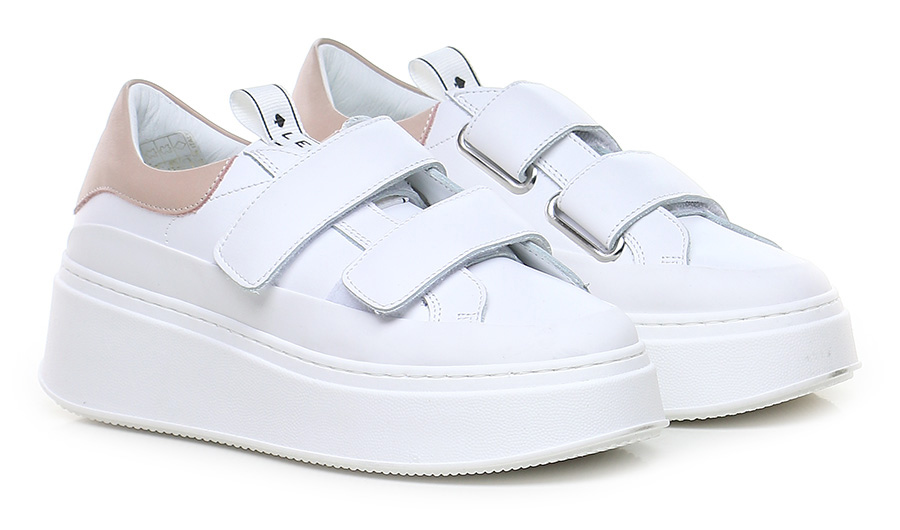 Leather sneaker with double front strap with velcro closure and rubber sole. 50mm heel height, 35mm platform with 15mm ledge.