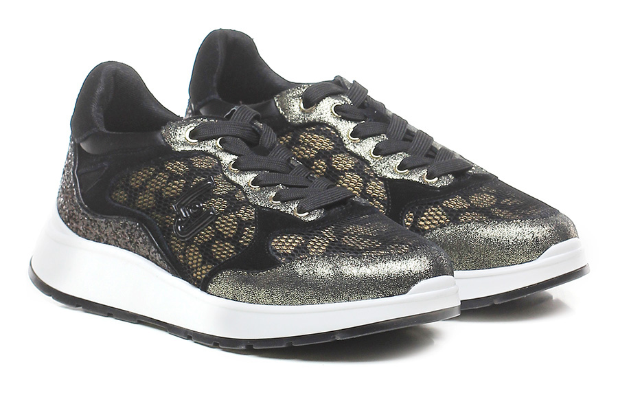 Sneaker in eco leather, suede covered in mesh fabric with toe in laminated eco leather, crack effect and glitter heel. Light rubber sole. Sole height: 55, platform 25 with 30 ledge.