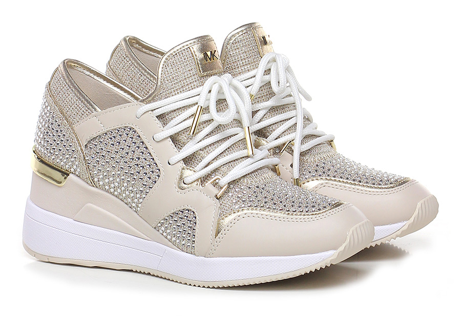 Sneaker in tessuto tempestata di strass,pelle, eco pelle e lurex, suola in gomma oversize. Altezza suola: 70, platform 20 con batttua 50.
