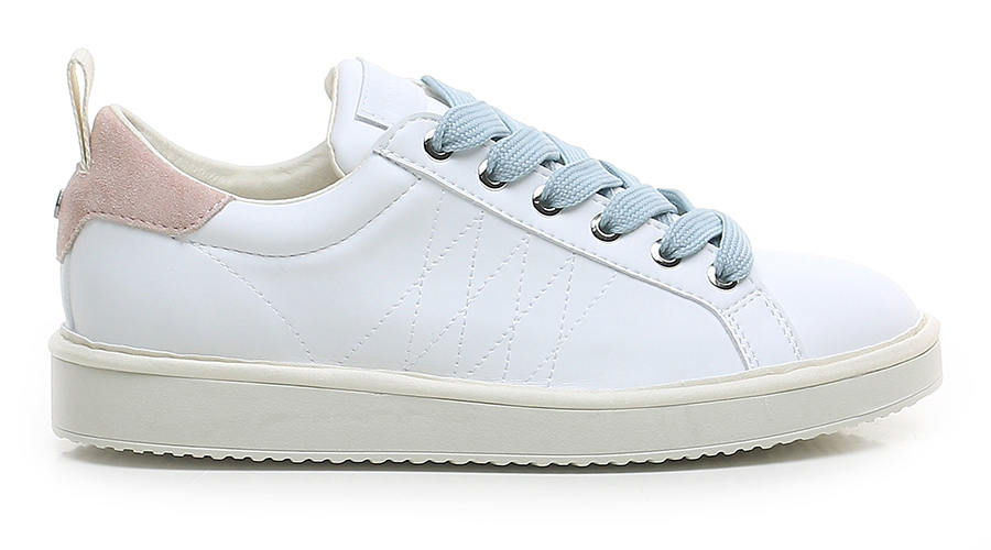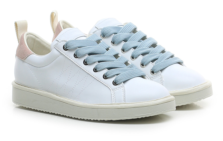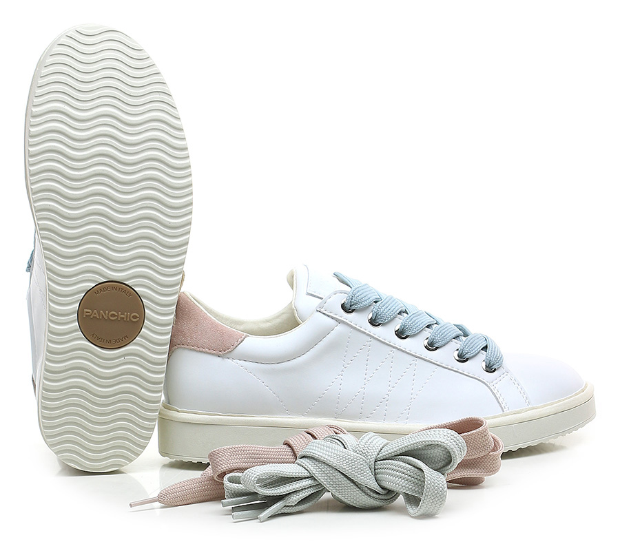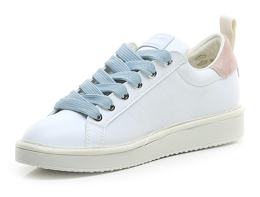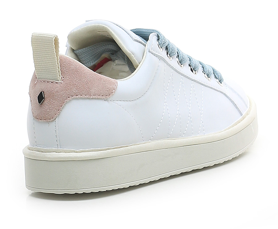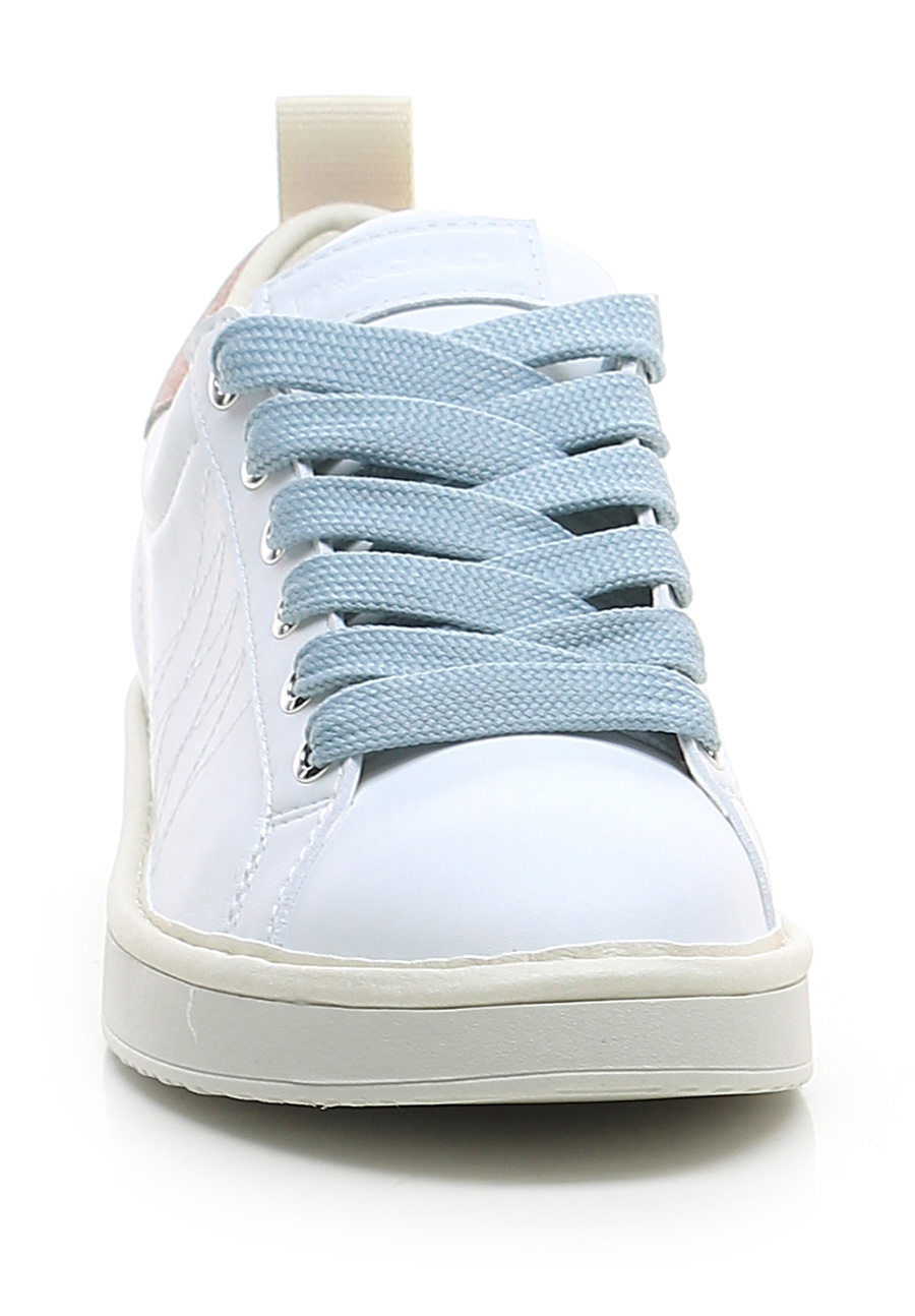 Faux leather sneaker with suede heel tab and rubber sole. Heel height 30mm, platform 20mm with 10mm ledge.
