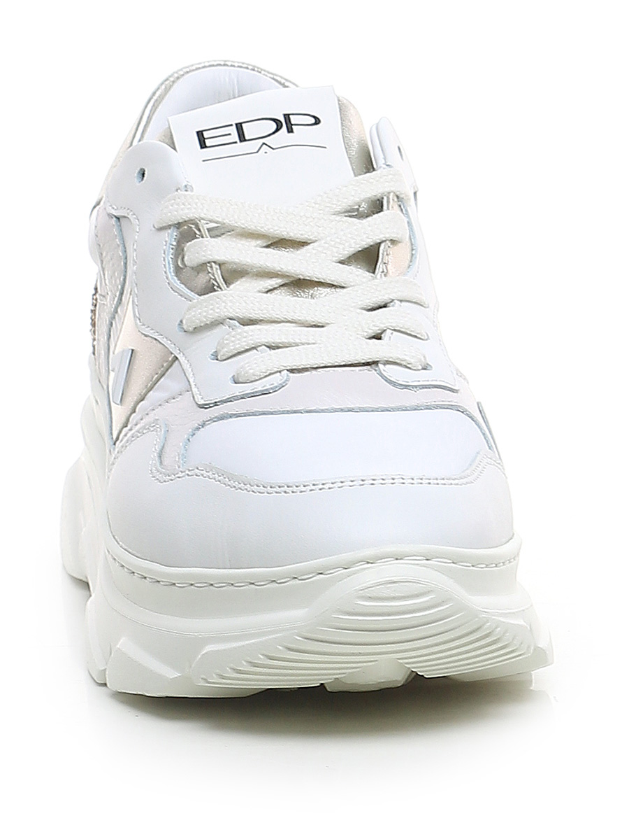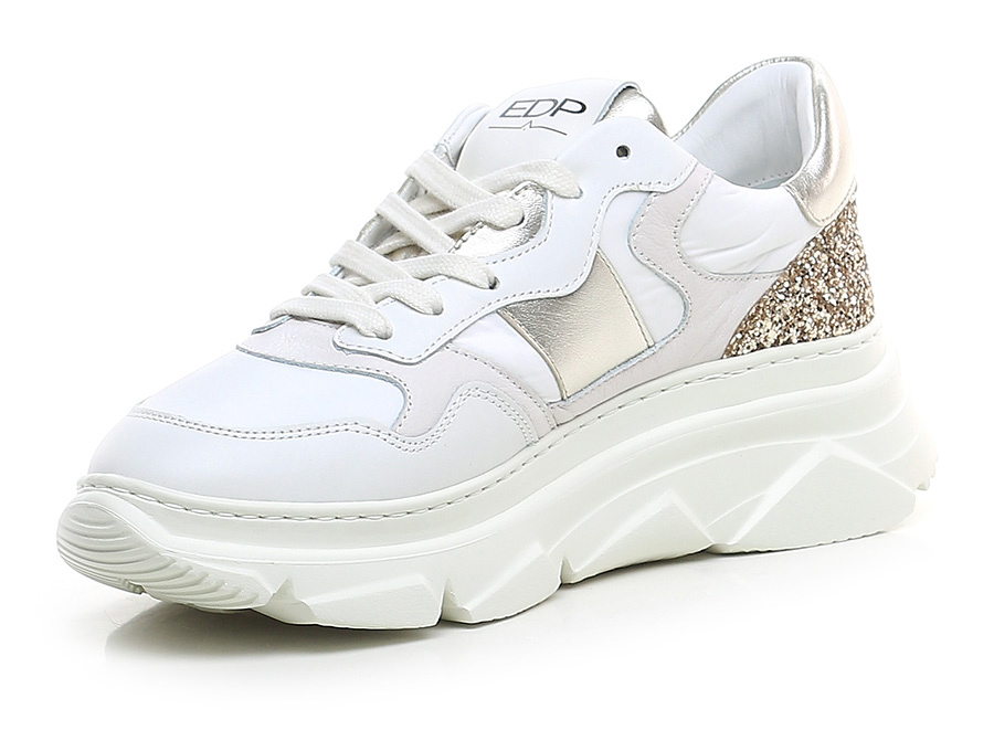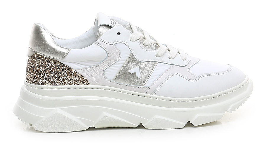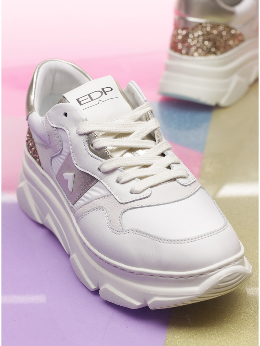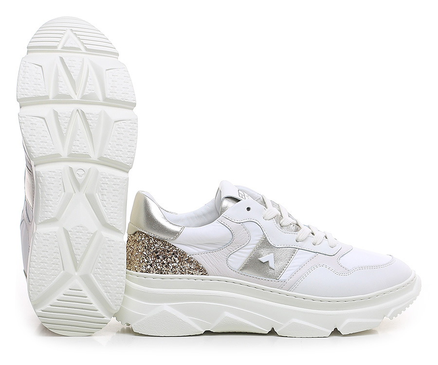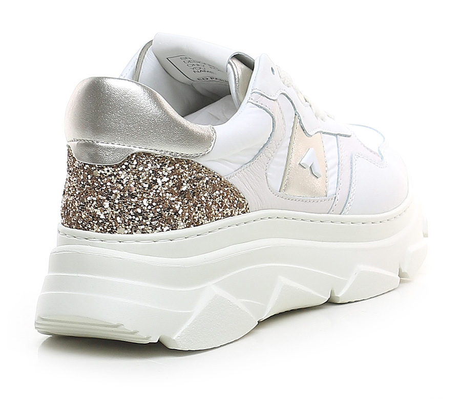Sneaker in fabric, faux leather and laminated leather with glitter insert. Rubber sole. 50mm heel height, 30mm platform with 20mm ledge.