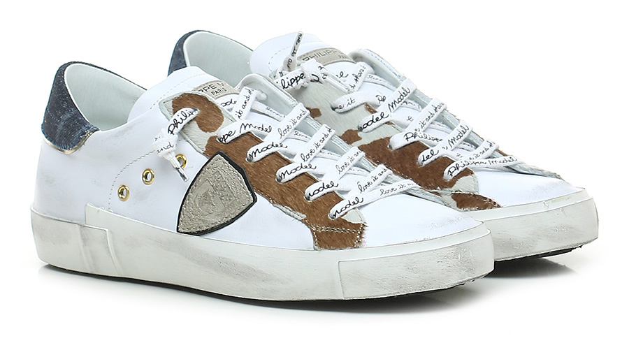Sneaker in pelle effetto vintage con inserti in cavallino e talloncino in jeans. Suola in gomma effetto vintage. Altezza suola 30mm, platform 20mm con battuta 10mm.