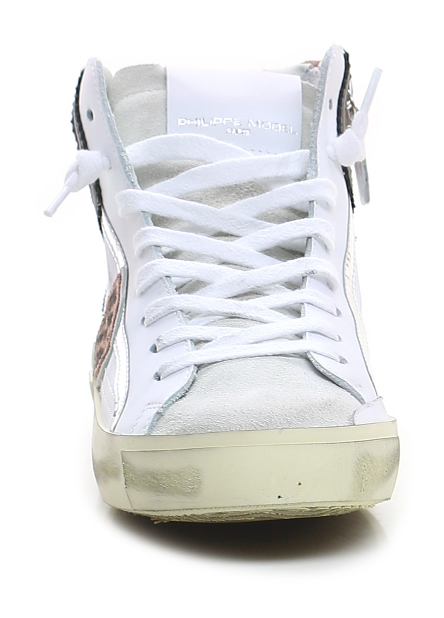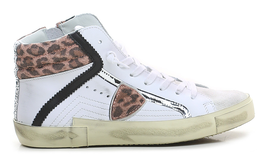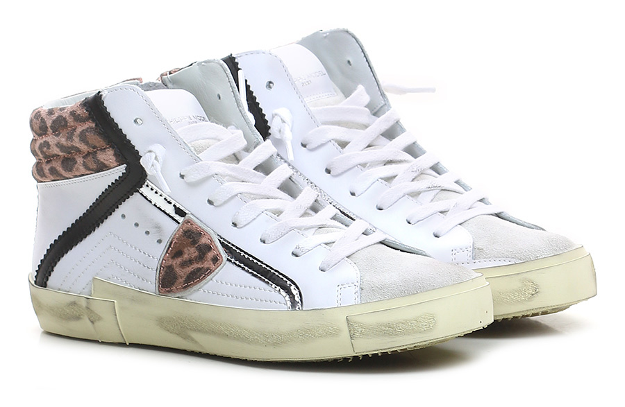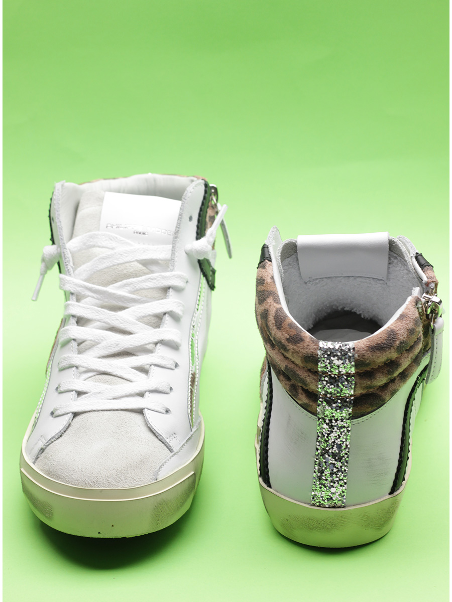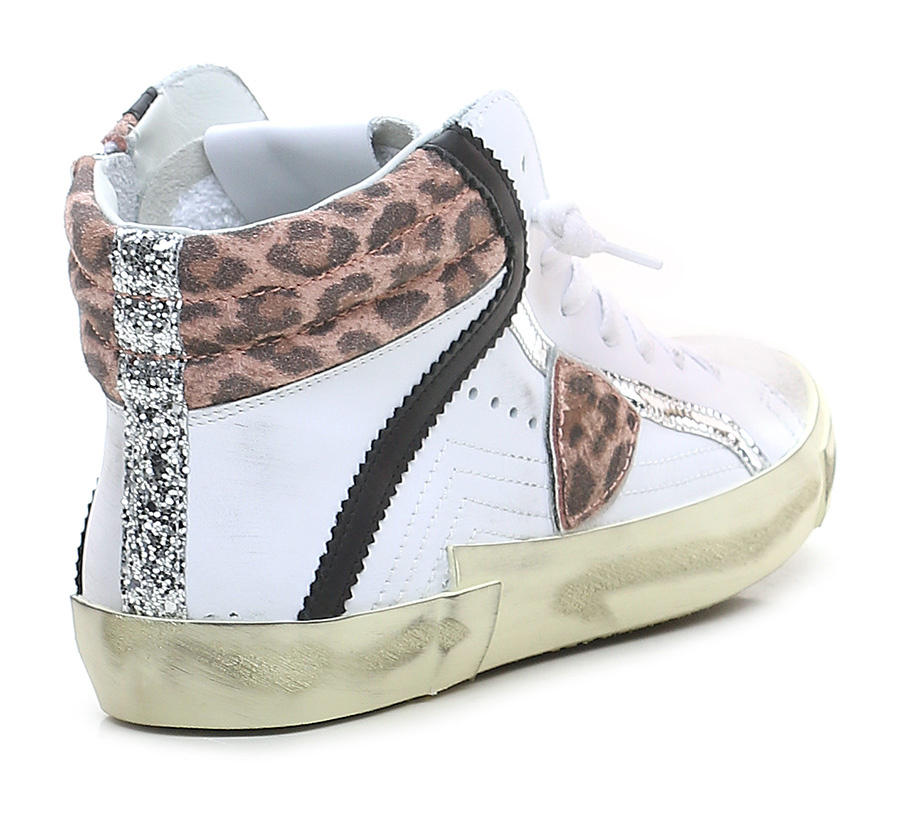 Sneaker in leather and suede both with a vintage effect, and inserts in leopard-print suede. Vintage effect rubber sole. 35mm heel height, 25mm platform with 10mm ledge.