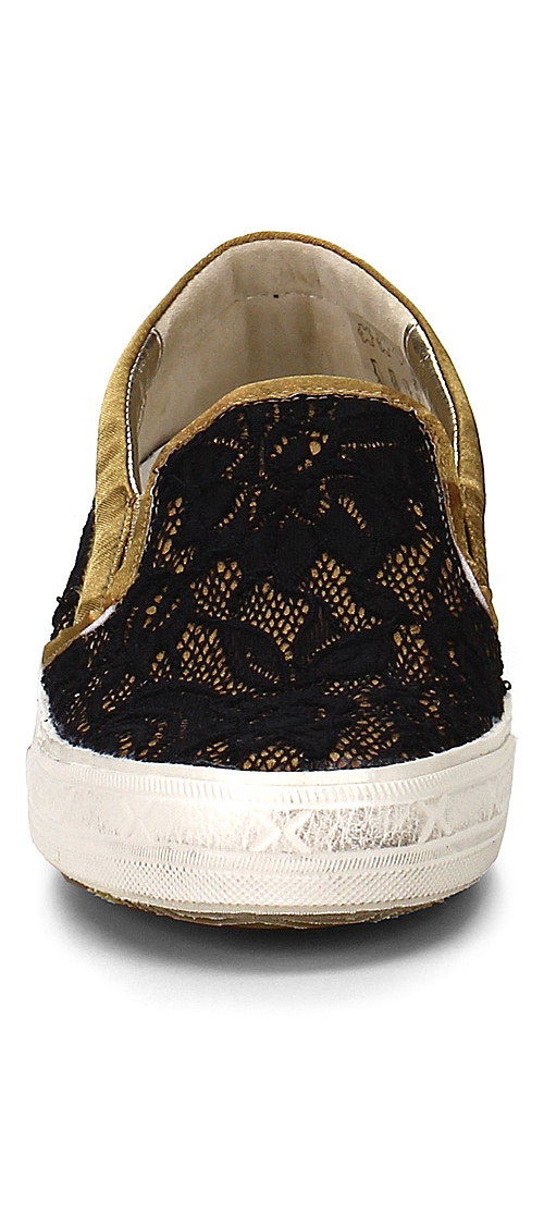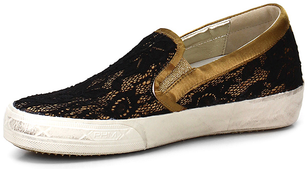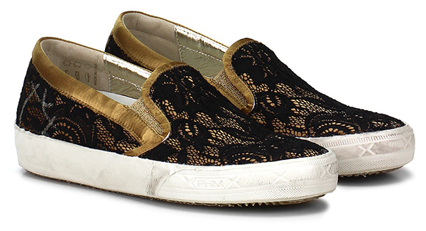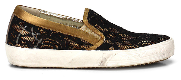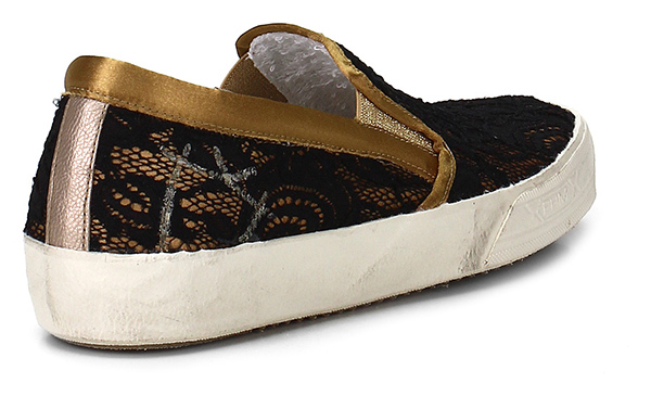 Sneaker in leather and embroidered lace with elastic bands on both sides. Vintage effect rubber sole, 30 heel, 25 platform with 5 ledge.