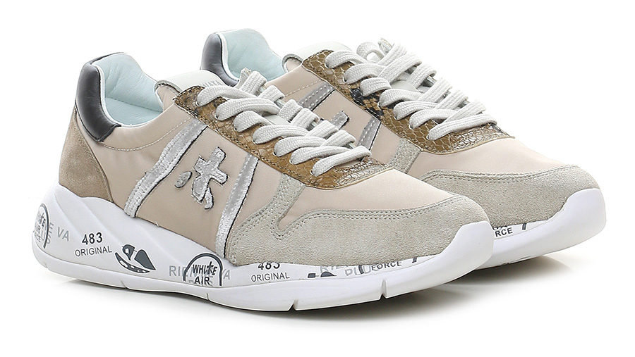 Sneaker in tessuto e camoscio, con inserti in pelle effetto pitone e velluto. Talloncino in pelle e suola in gomma. Altezza tacco 35mm, platform 25mm con battuta 10mm.