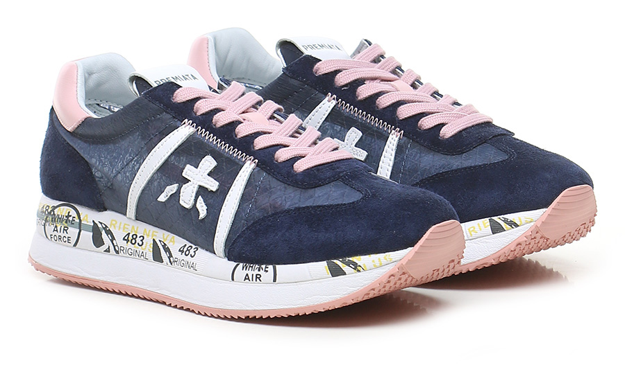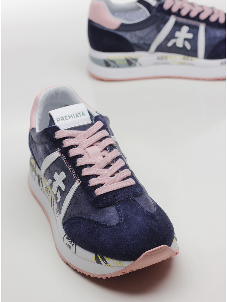Fabric and suede sneaker with leather inserts and rubber sole. 40mm heel height, 30mm platform with 10mm ledge.