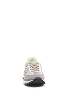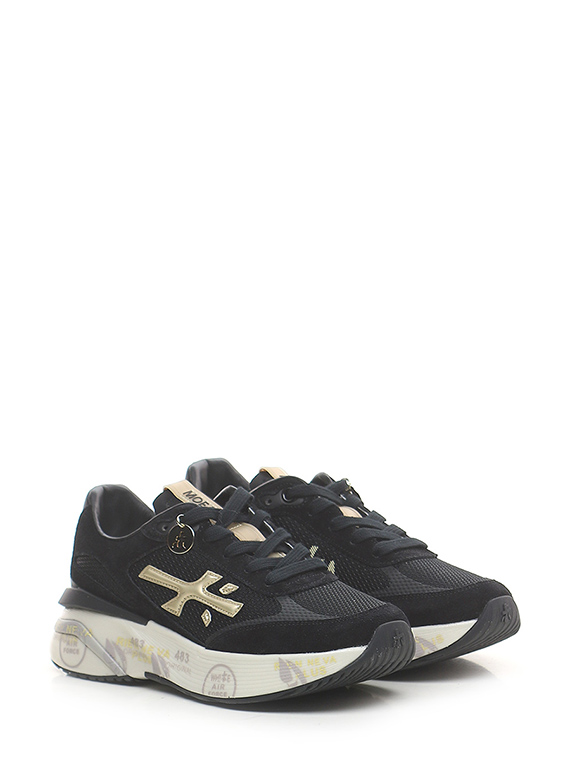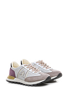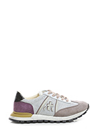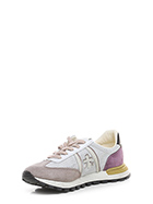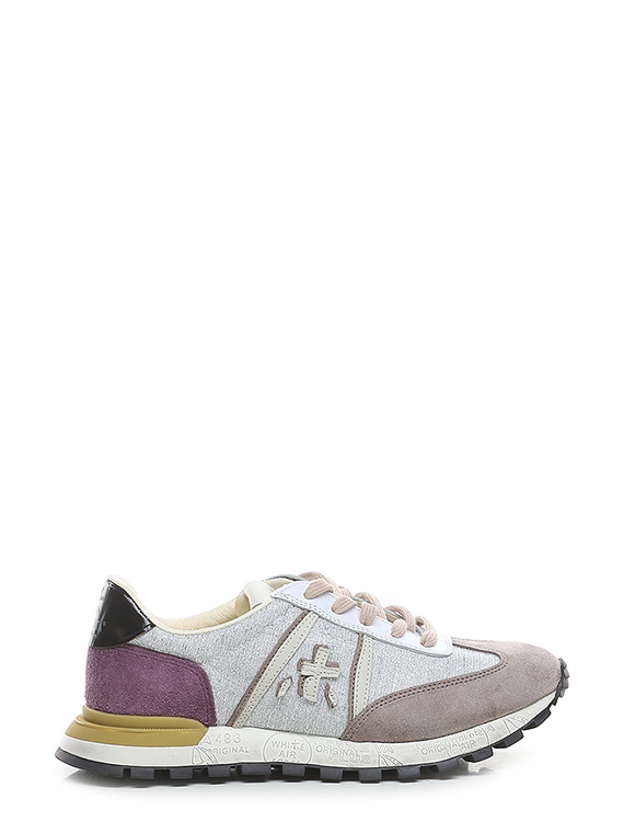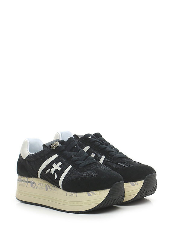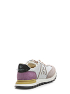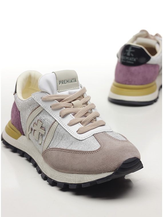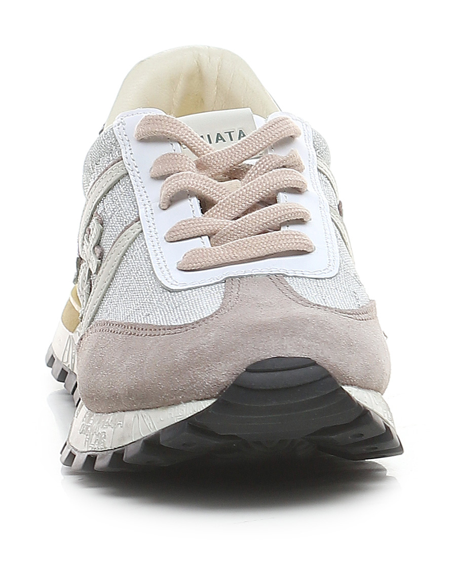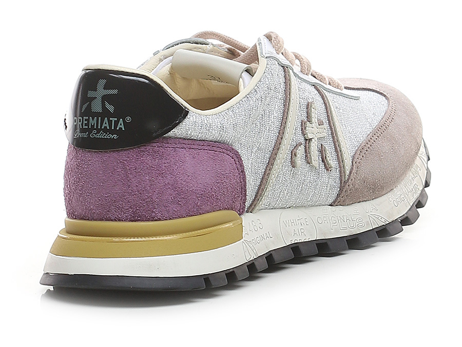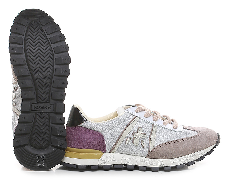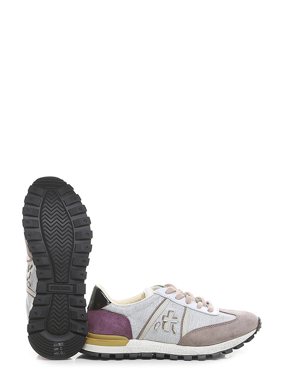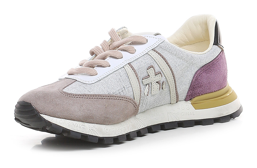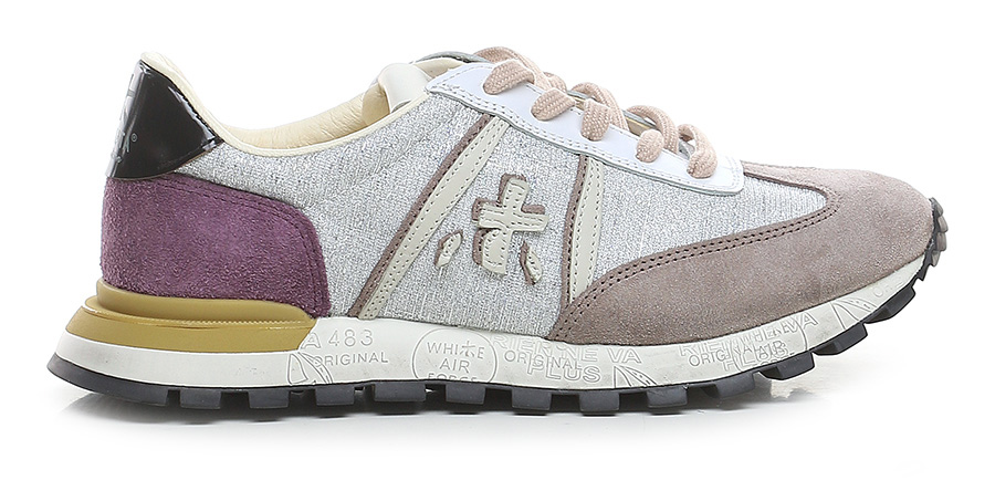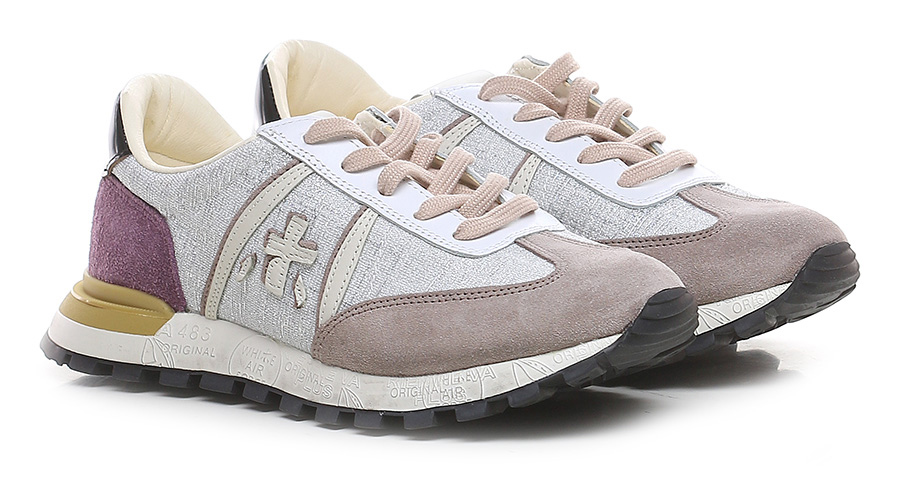 Lurex and suede sneaker with leather inserts. Rubber sole. Heel height 30mm, platform 20mm with 10mm ledge.