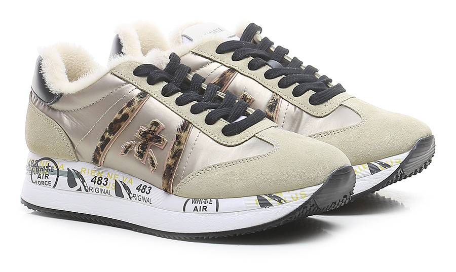 Sneaker in tessuto laminato, camoscio con inserti effetto cavallino leopard. Interno in fake fur. Suola in gomma. Altezza tacco 40mm, platform 25mm con battuta di 15mm.