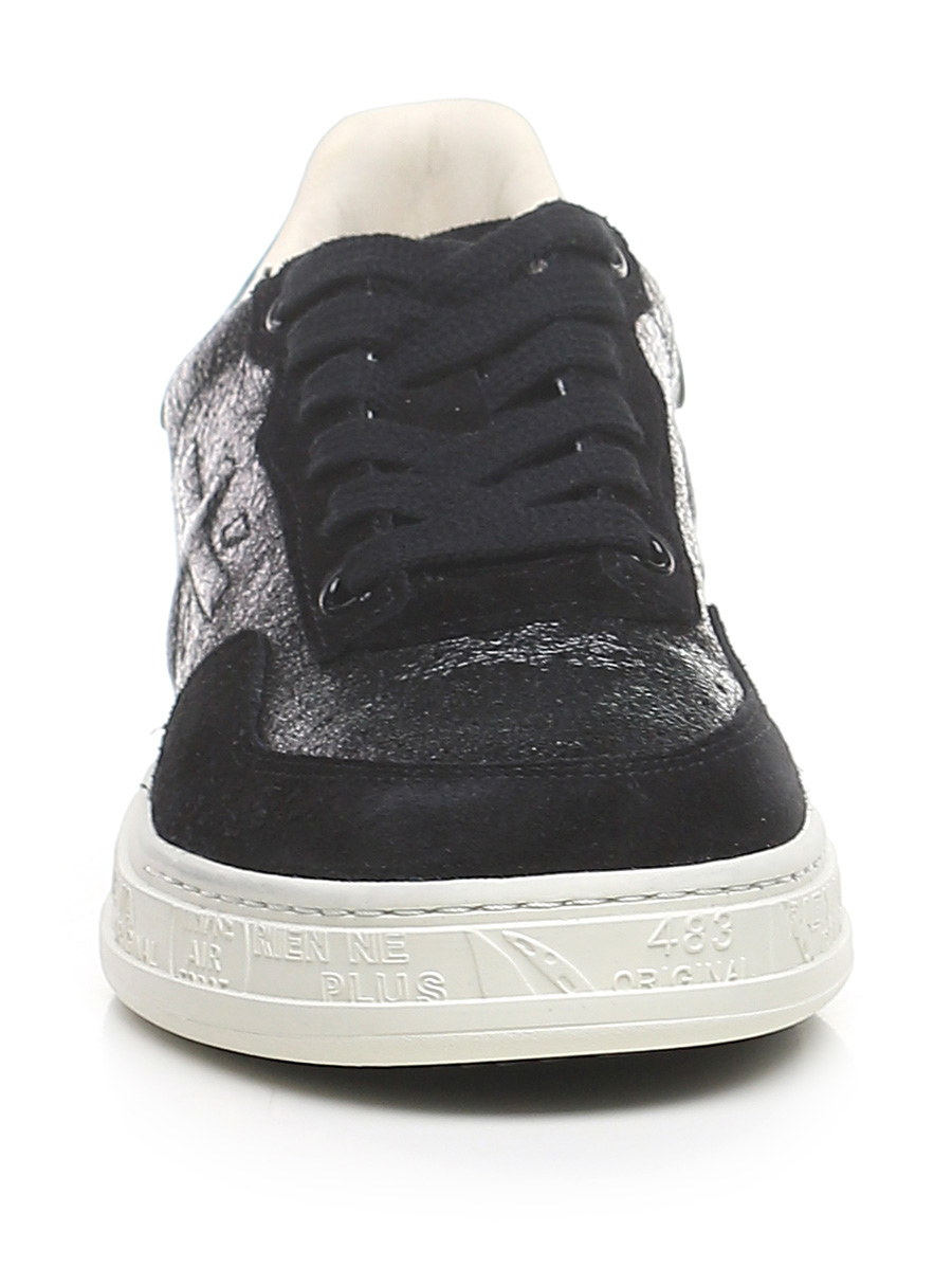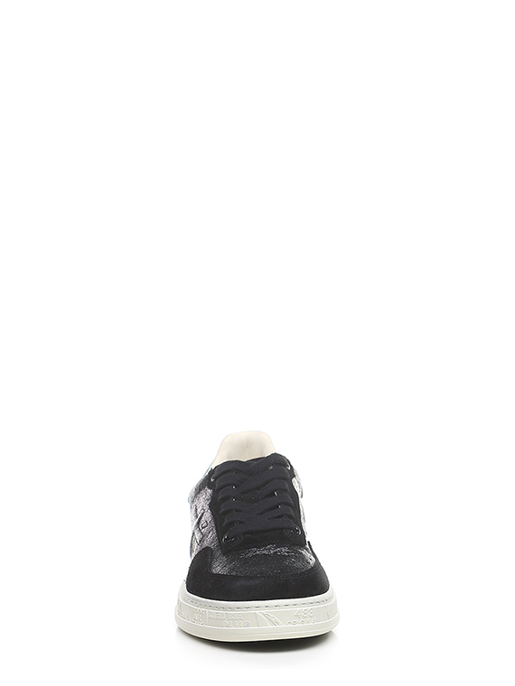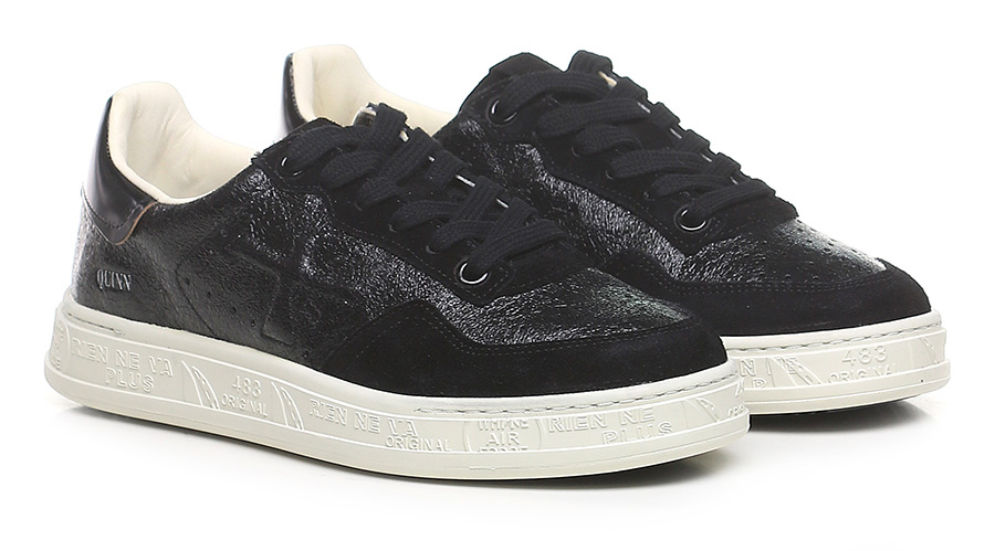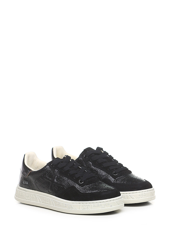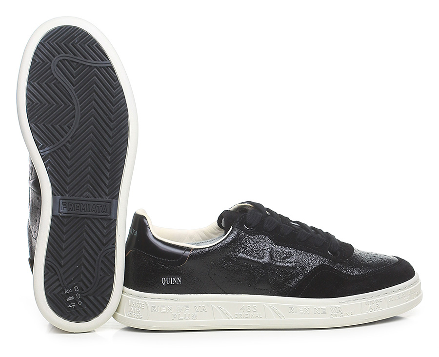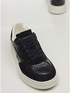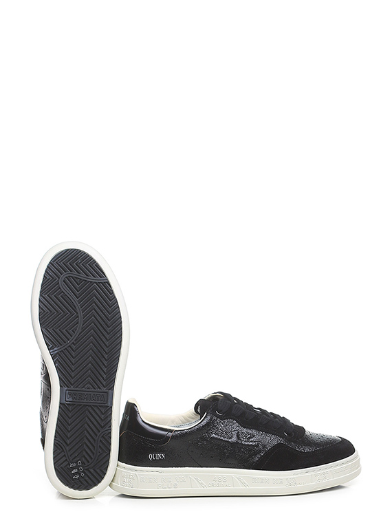 Shiny crack-effect leather and suede sneaker with brushed leather heel tab and rubber sole. Heel height 30mm, platform 25mm with 5mm ledge.