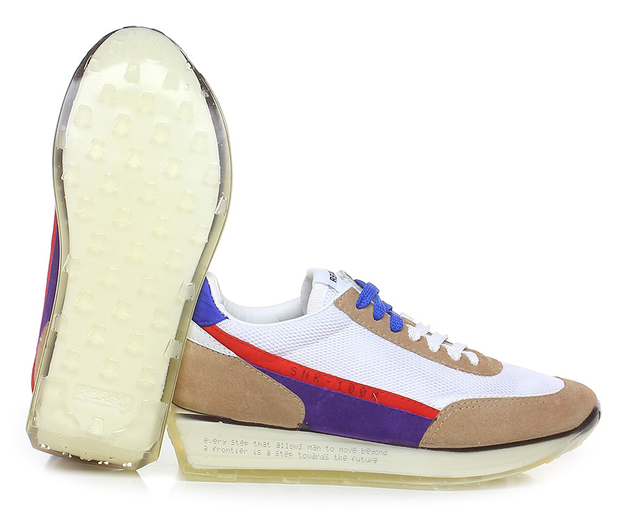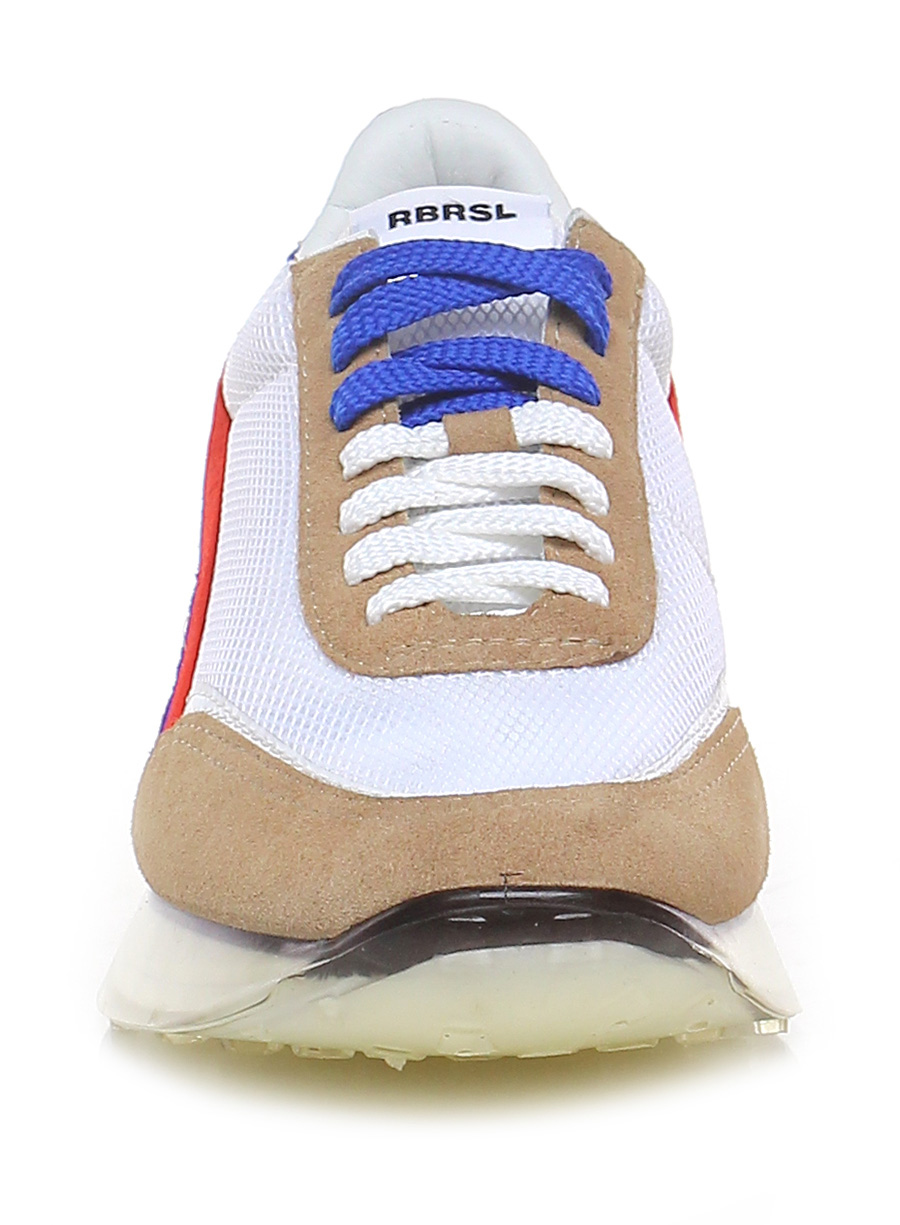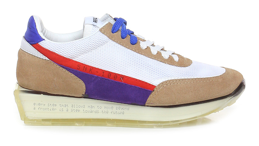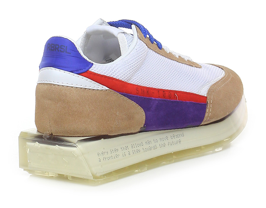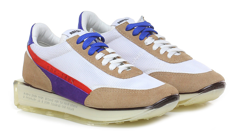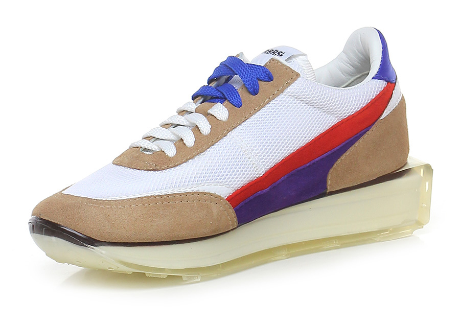 Sneaker in fabric and suede, rubber sole covered by hand using transparent liquid material poured into a mold and catalysed at high temperature. 40 heel, 25 platform with 15 bar.
