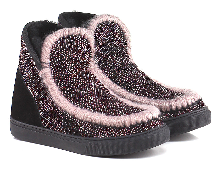 Sneaker in camoscio con glitter su tomaia e fake fur interno. Suola in gomma, tacco 25, zeppa interna 35.