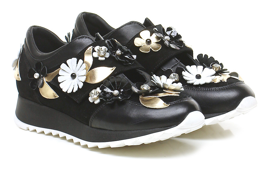 Sneaker in pelle e camoscio con strap frontale e pietre. Suola in gomma, tacco 35, platform 20 con battuta 15.