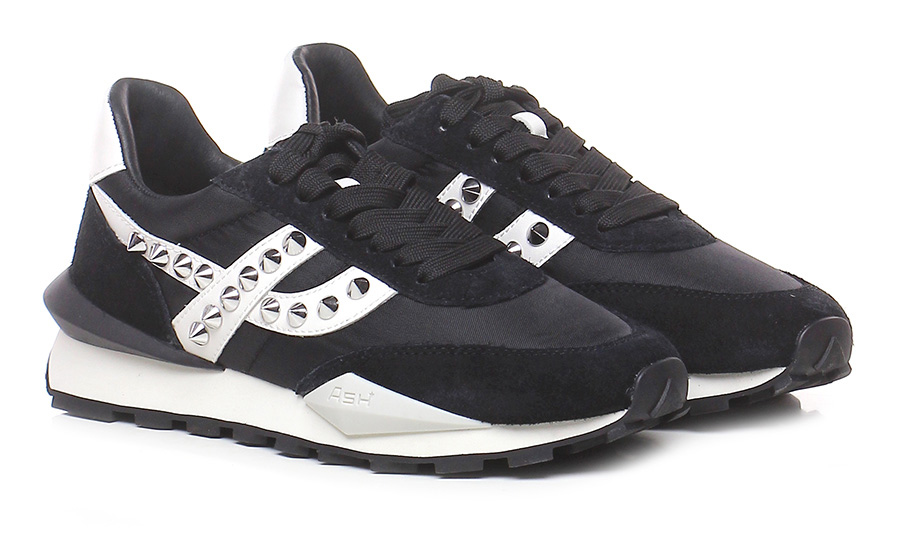 Sneaker in tessuto, camoscio e pelle con borchie lato interno ed esterno, suola in gomma. Altezza suola: 40, platform 20 con battuta 20.