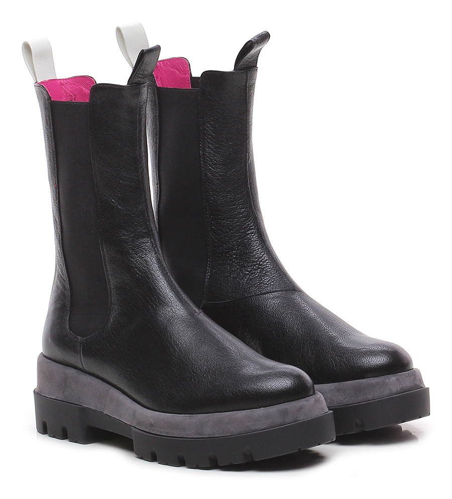 Tronchetto in pelle effetto martellato e pelle, inserti elasticizzati ambo i lati e suola in gomma. Tacco 55, platform 35 con battuta 20. Suola rivestita in camoscio.