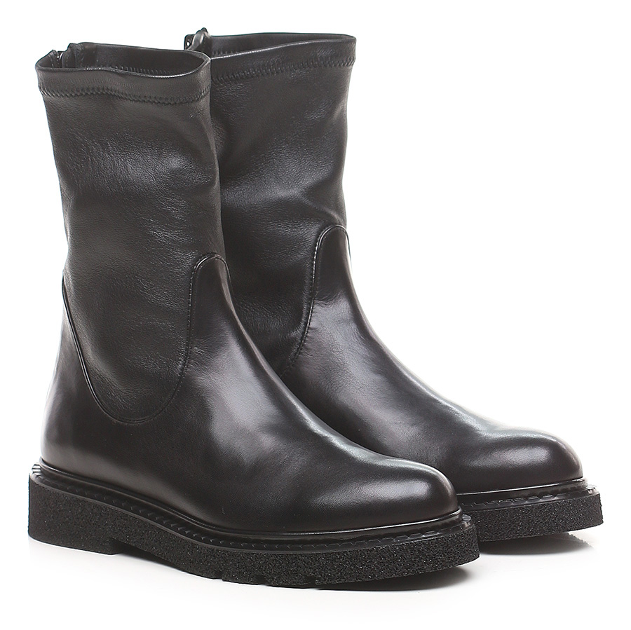 Tronchetto in pelle e pelle stretch con zip sul retro e suola in gomma. Altezza tacco 35mm, platform 20mm con battuta 15mm.