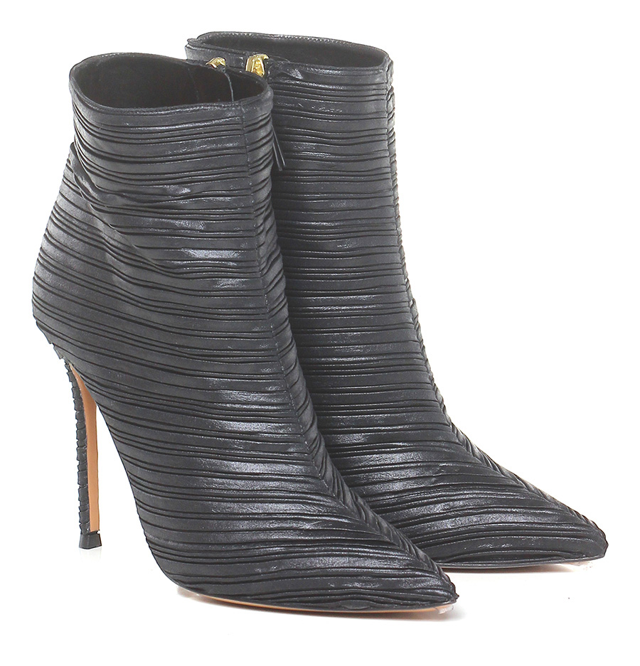 Tronchetto in tessuto con zip su lato interno e suola in cuoio. Tacco 110.