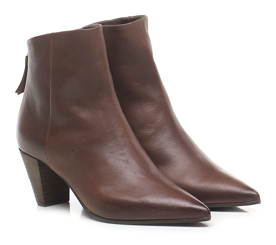 Tronchetto in pelle effetto vintage con zip sul dietro, suola in gomma. Tacco 65, effetto legno.