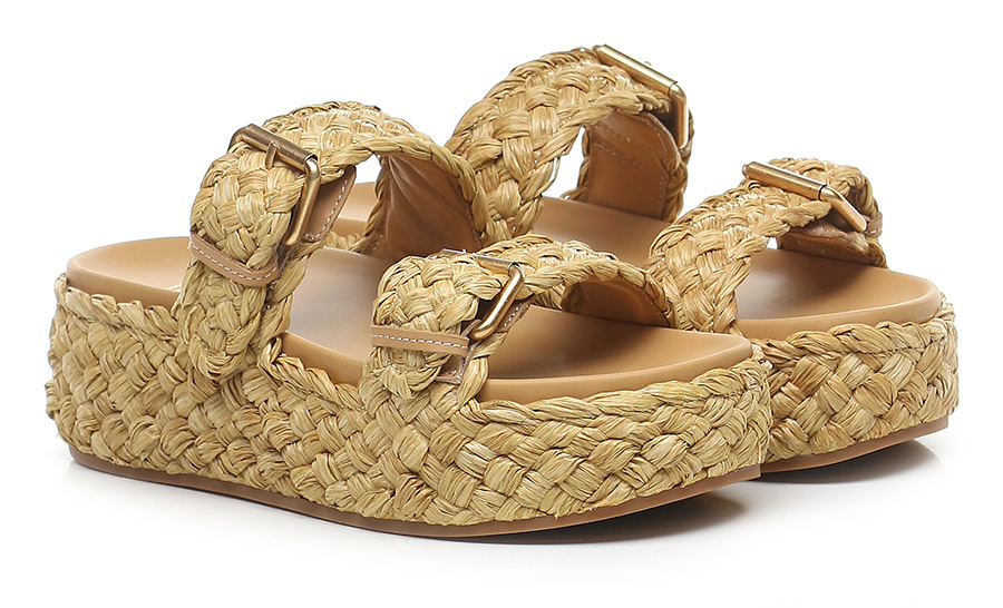 Woven raffia wedge with double adjustable front strap and rubber sole. Heel height 60mm, platform 50mm with 10mm ledge. Part of the wedge lined with woven raffia.