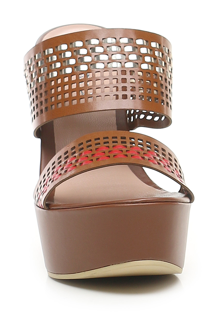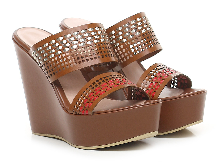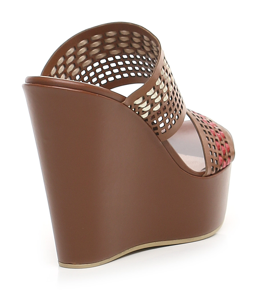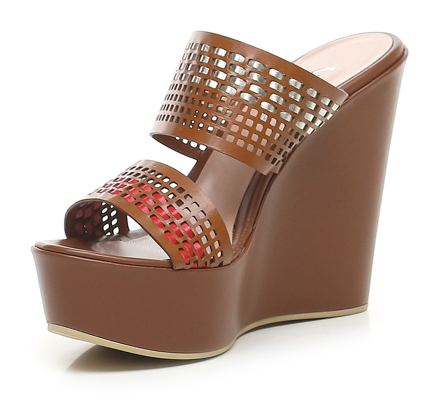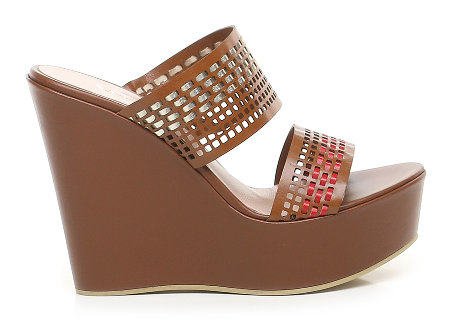Wedge in worked leather and perforated leather with rubber sole. Heel height 125mm, platform 40mm with 85mm ledge. Wedge lined in leather.