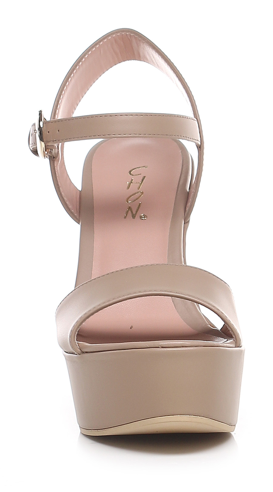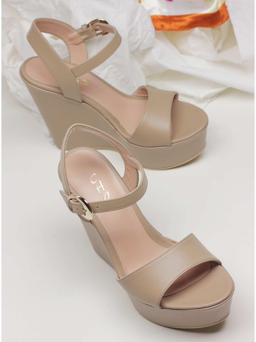 Leather wedge with ankle strap and rubber sole. Heel height 125mm, platform 45mm with 80mm ledge.