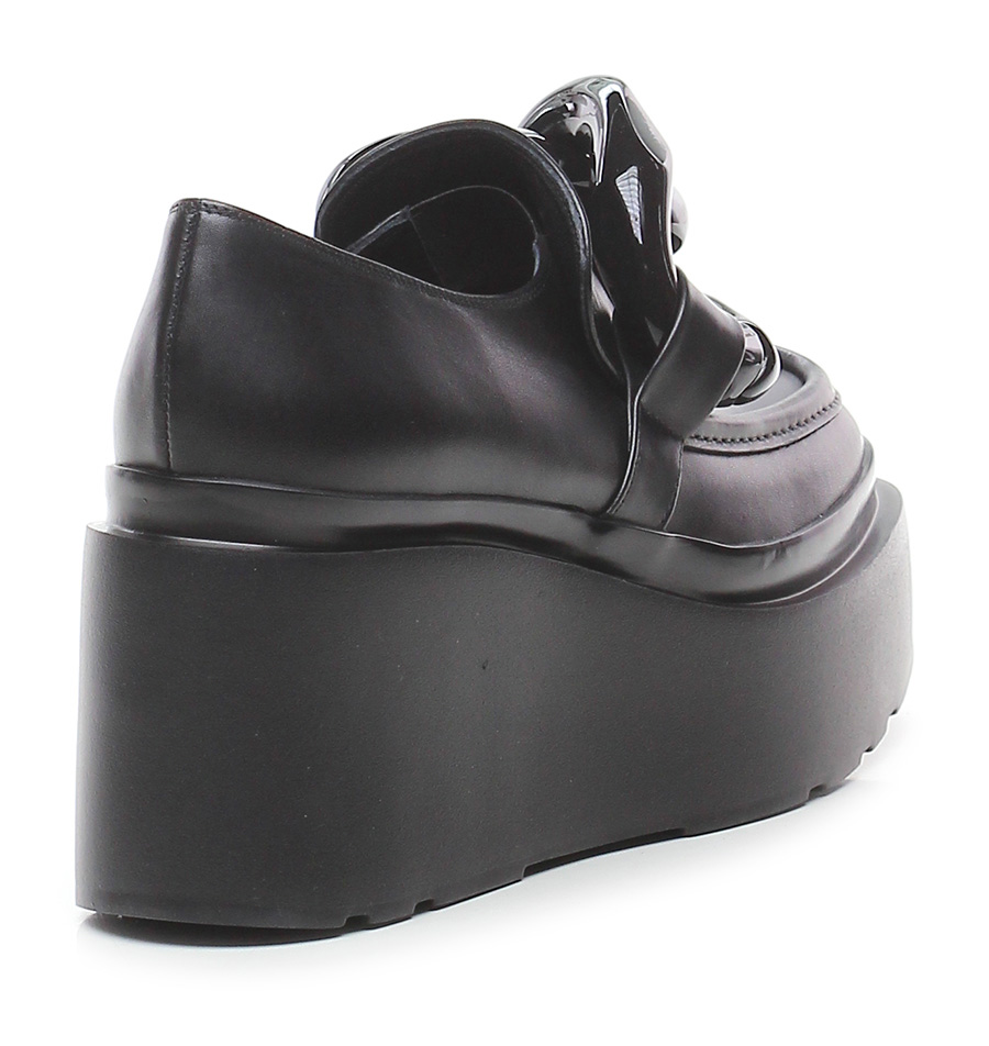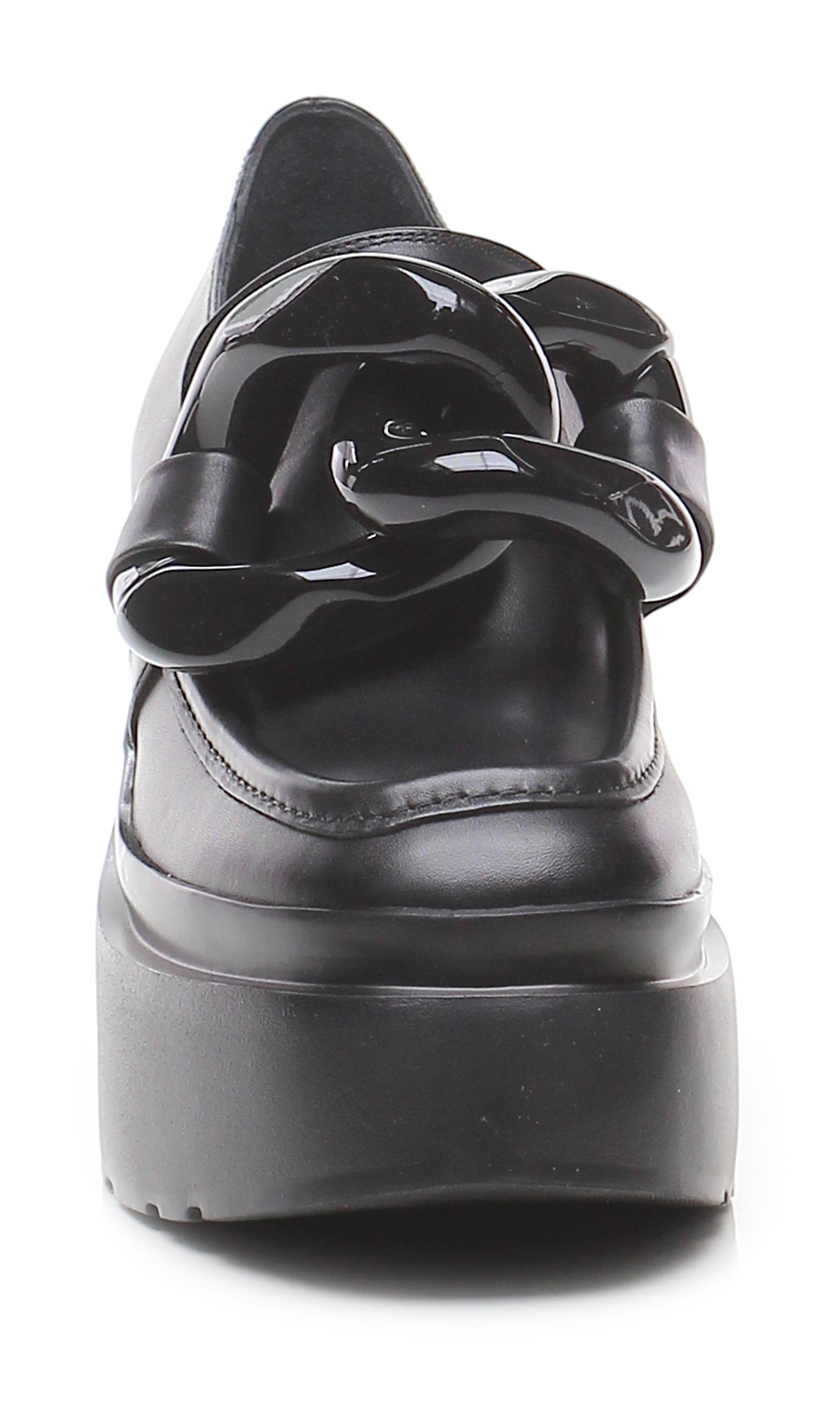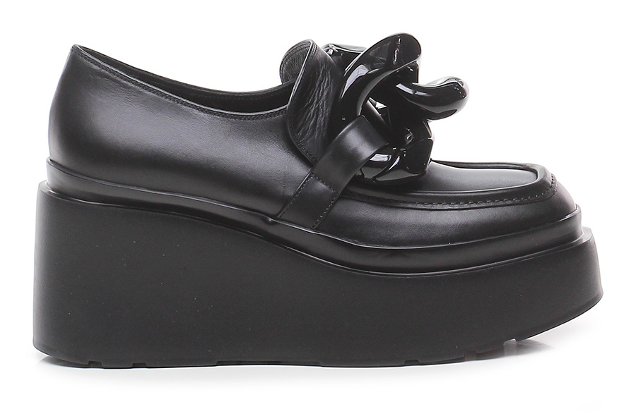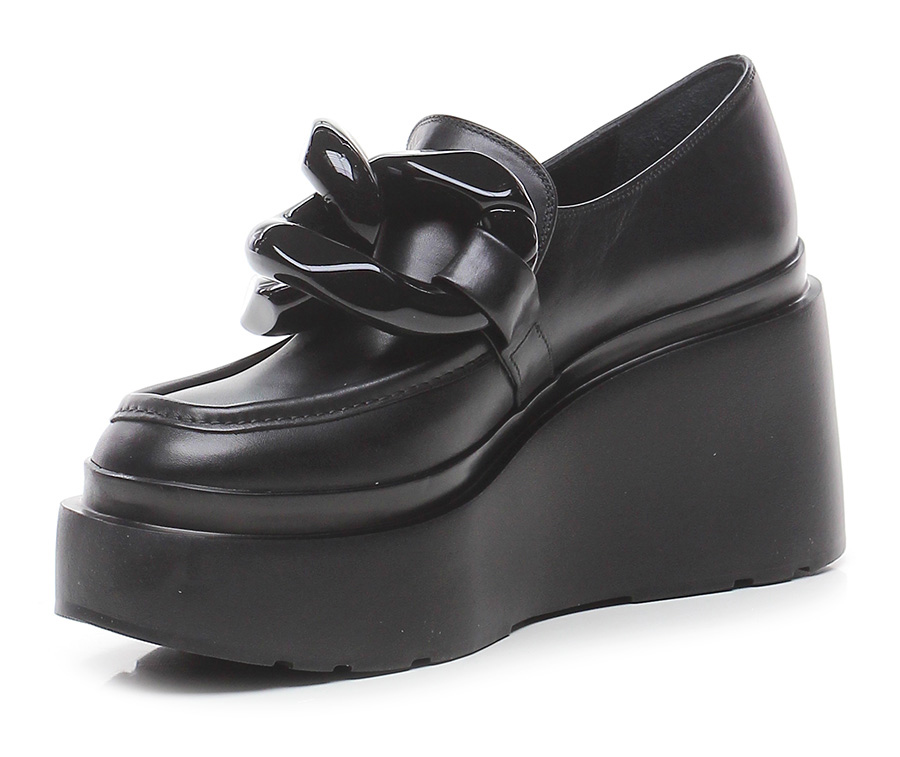 Leather wedge with front maxi chain accessory, rubber sole. Heel 95, platform 55 with ledge 40.