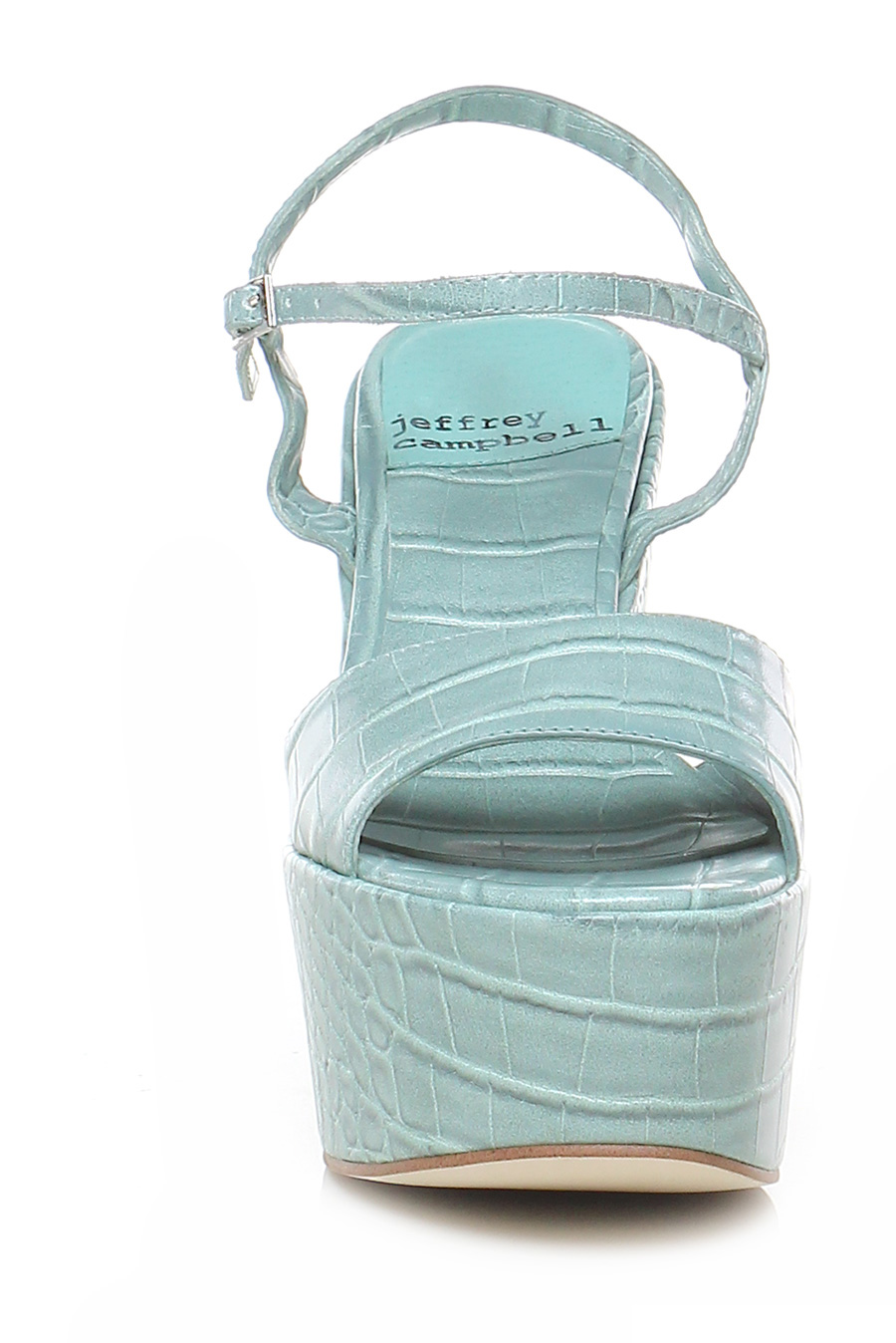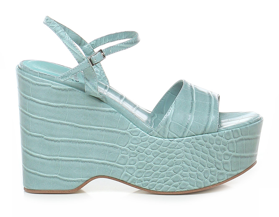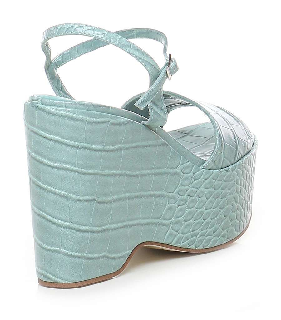Wedge in crocodile print leather with ankle strap, rubber sole. Heel 120, platform 60 with ledge 60. Wedge covered in crocodile print leather.