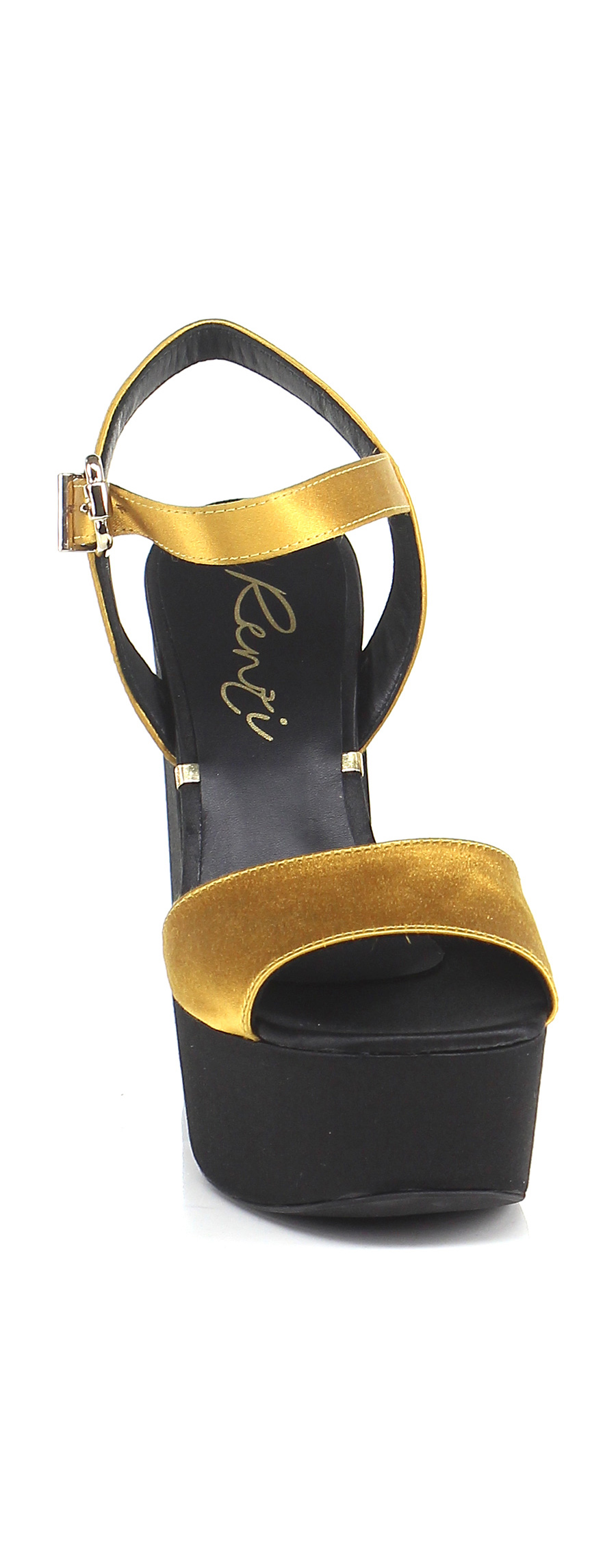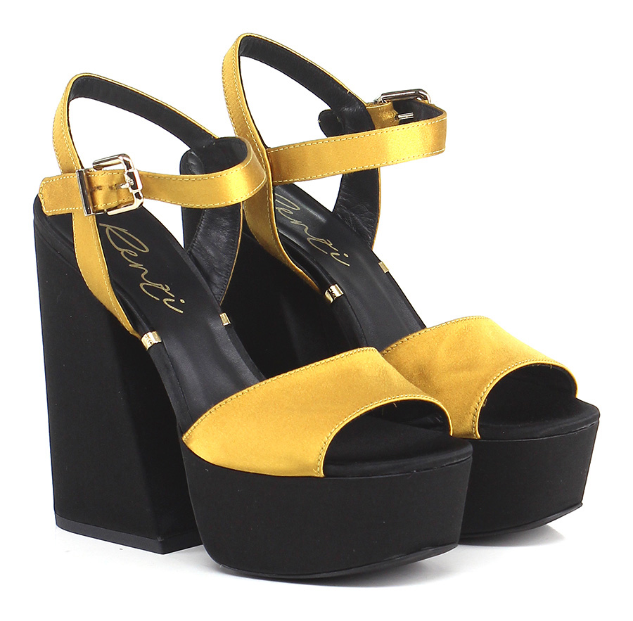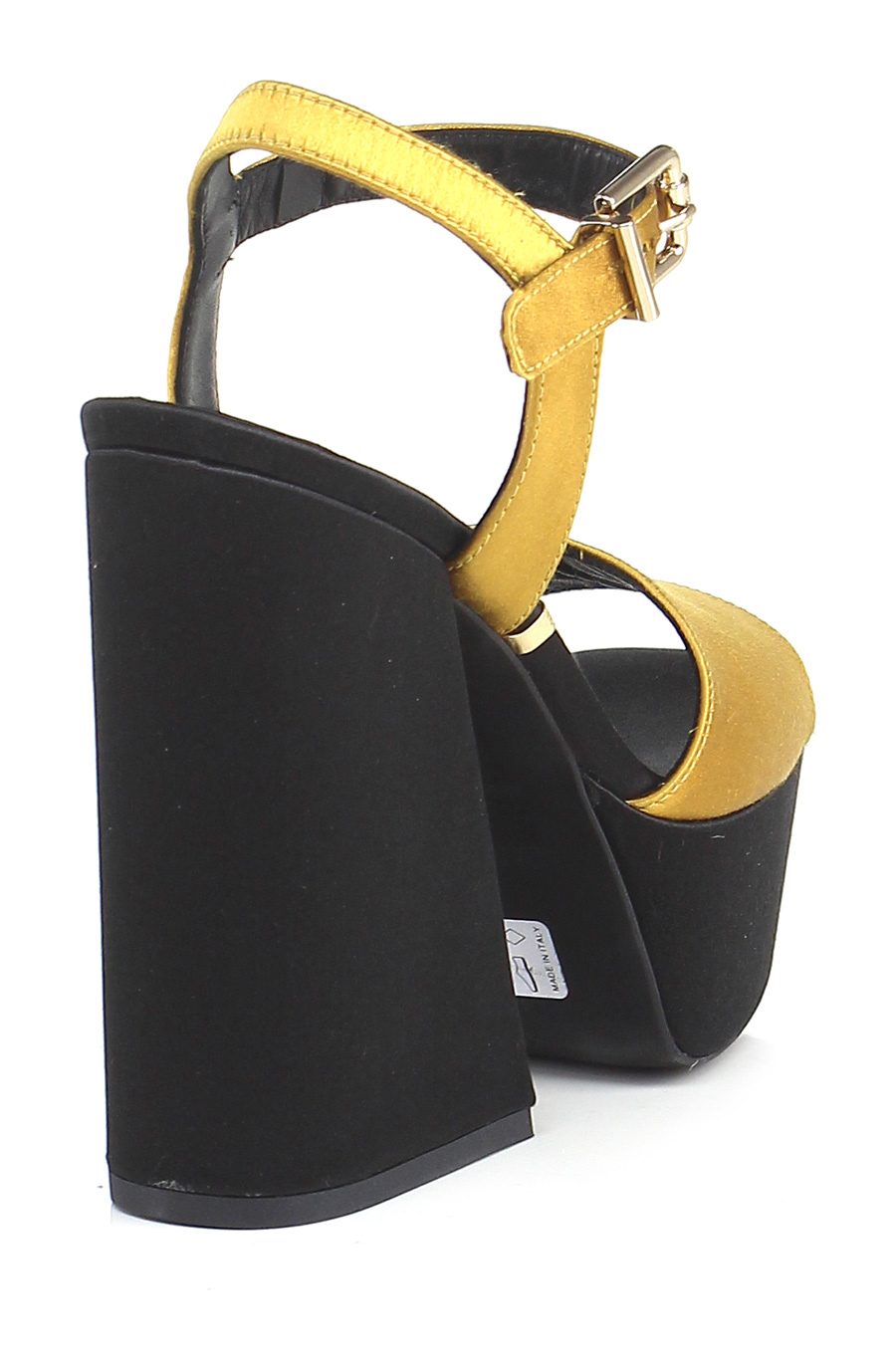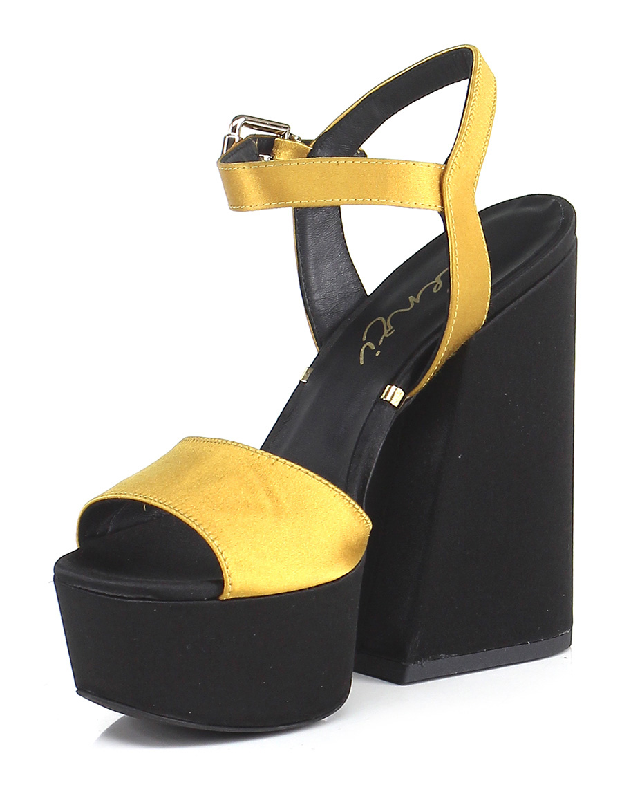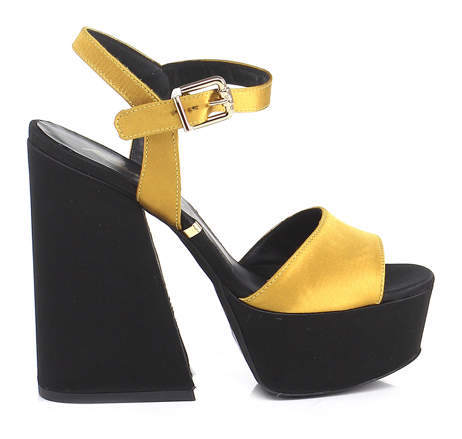 High sandal in satin fabric with ankle strap and rubber sole. 140 heel, 50 platform with 90 ledge.