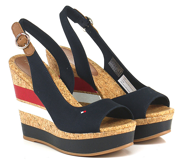 Zeppa in pelle e tessuto con cinturino su retro e suola in gomma. Tacco 115, platform 35 con battuta 80.