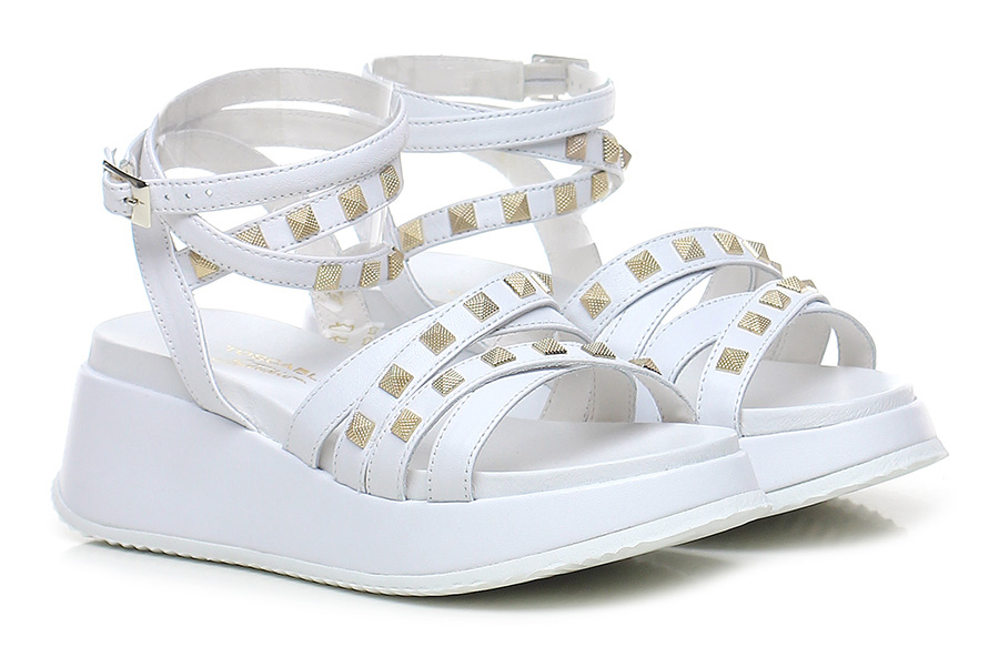 Leather wedge heel with leather ankle straps and studs on the upper, rubber sole. 60 heel, 40 platform with 20 bar.