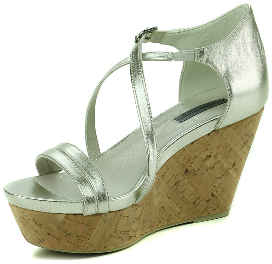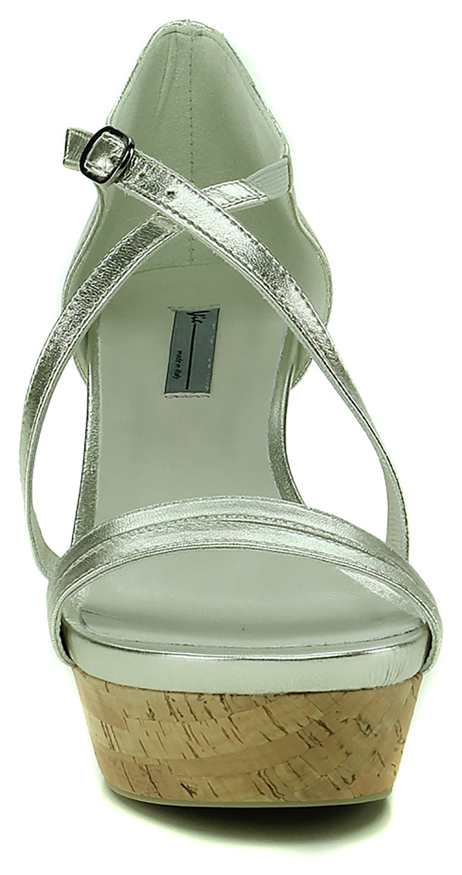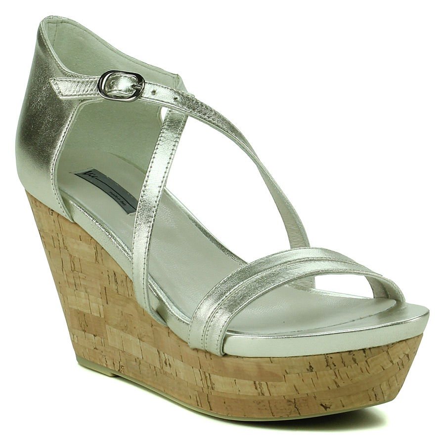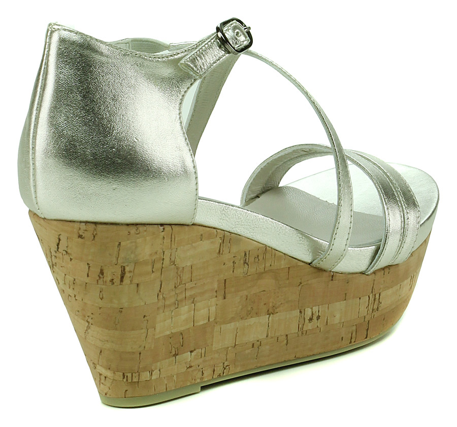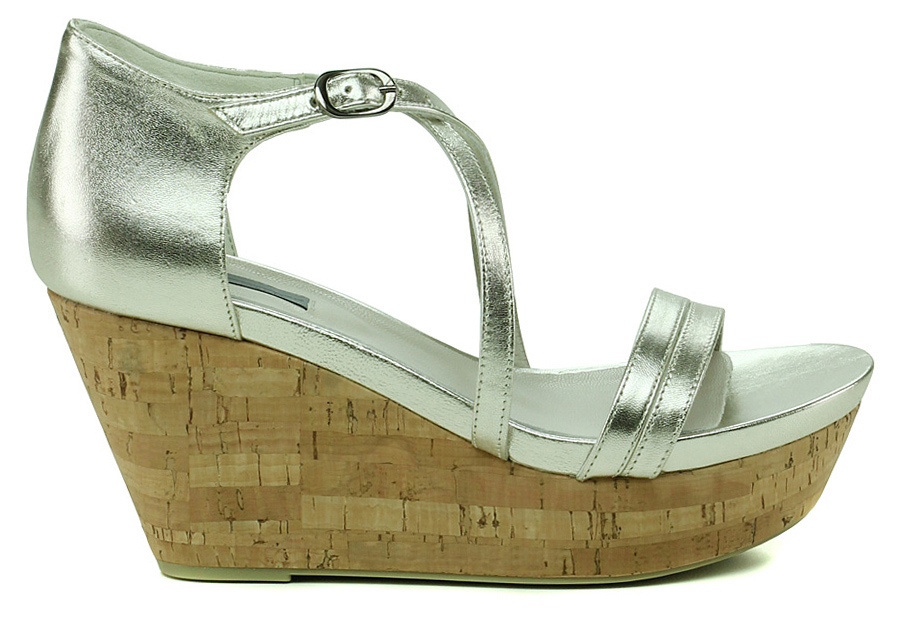 Wedge in laminated leather with rubber sole and instep strap with buckle. 85 cork heel, 40 platform with 45 ledge.
