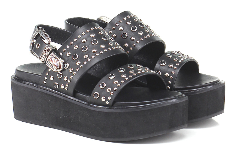 Zeppa in pelle con cinturino su retro e multi borchie e strass su tomaia. Suola in gomma, tacco 65, platform 50 con battuta 15.