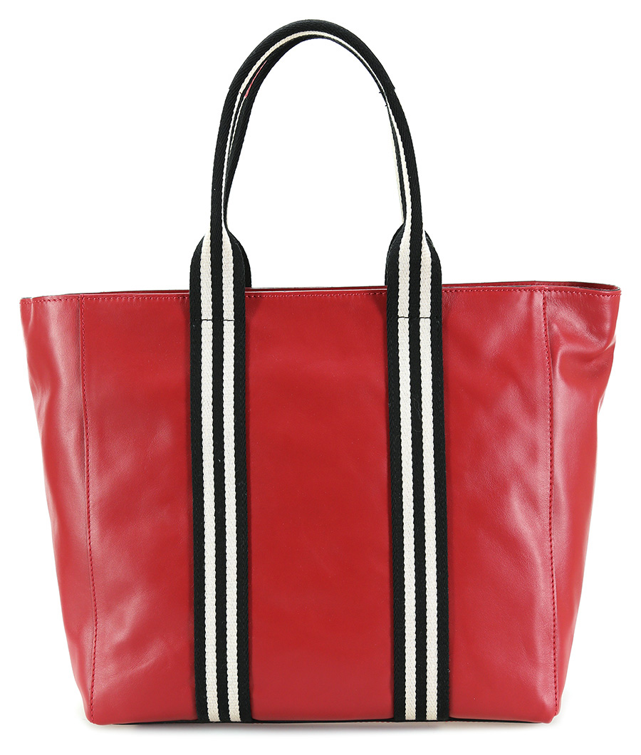 Borsa in pelle con chiusura zip. Manici in tessuto. Misure 38 x 33 cm. Dettagli gold.